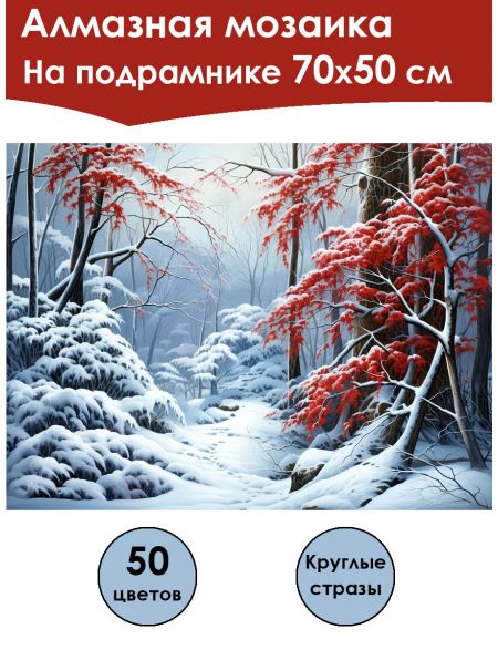 Алмазная мозаика на подрамнике «Заснеженная рябина» 70x50 см, 50 цветов