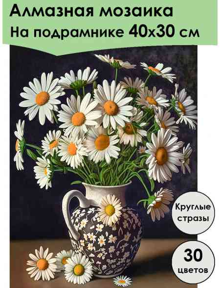 Алмазная мозаика на подрамнике «Ромашки в вазе» 40x30 см, 30 цветов