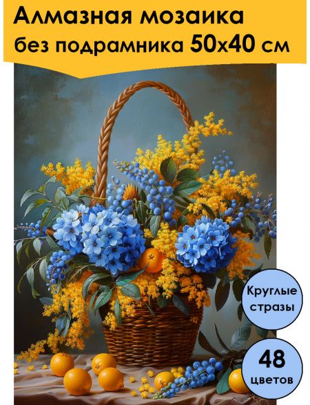 Алмазная мозаика без подрамника «Корзинка цветов» 70x50 см, 50 цветов