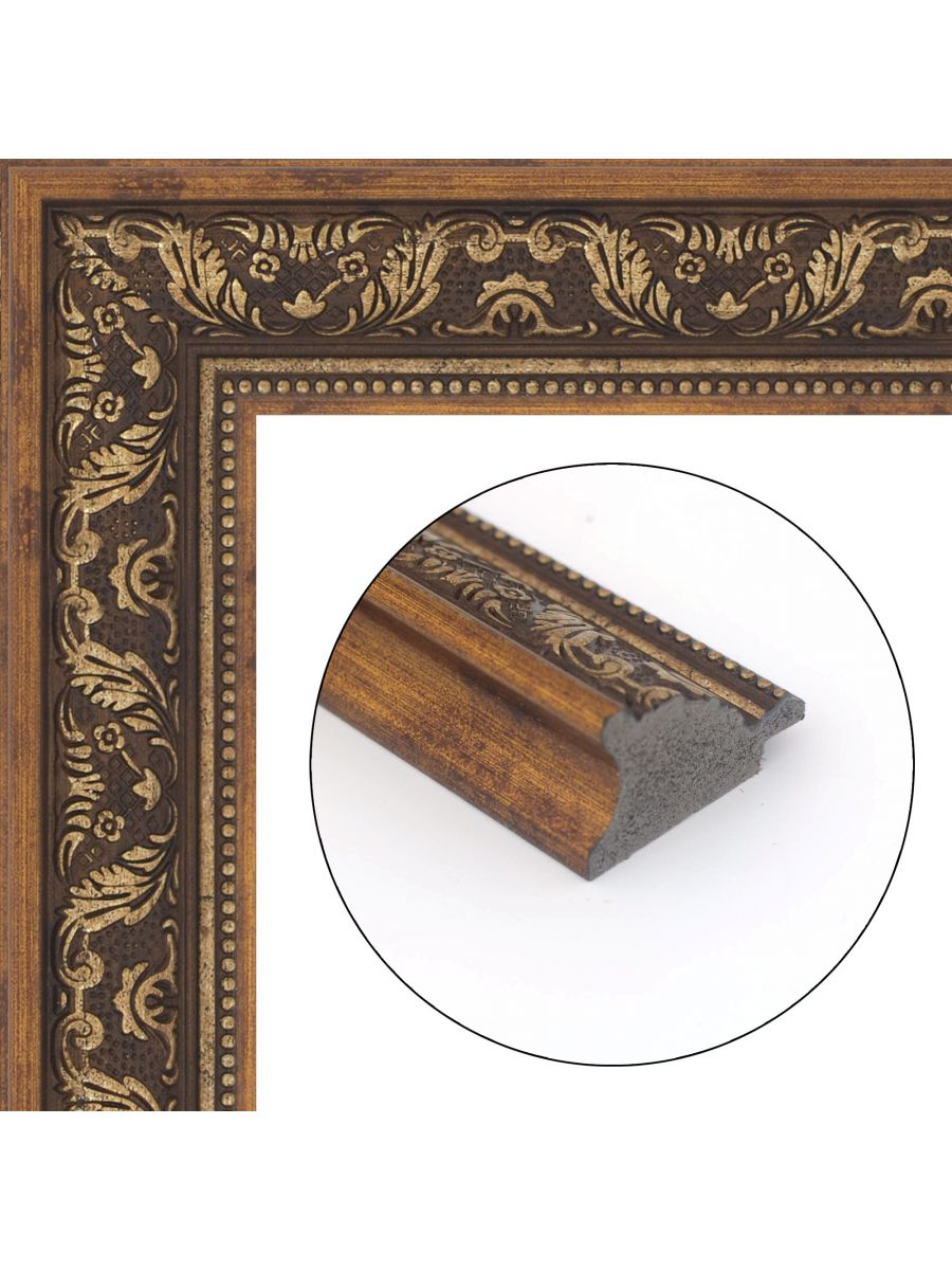 Багетная рамка изготовлена из пластика, имеются лепестки для закрепления работы. Стилизована под резное дерево. Доставляется в деревянном каркасе, который предотвращает повреждение рамки при транспортировке. Используется акриловое стекло, оно очень похоже на настоящее стекло, но не бьётся при транспортировке. На стекле имеется защитная плёнка от царапин с двух сторон, после вставки в рамку картины защитную плёнку со стекла нужно удалить. Рамка подойдёт для всех типов картин, алмазных мозаек, вышивок, а так же картин по номерам. В характеристиках товара указаны внутренние размеры рамки.