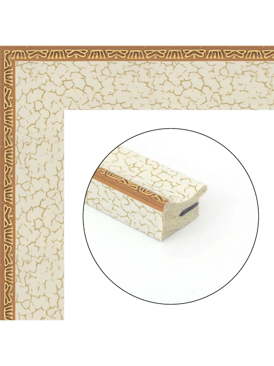 Багетная рамка изготовлена из пластика, имеются лепестки для закрепления работы. Стилизована под резное дерево. Доставляется в деревянном каркасе, который предотвращает повреждение рамки при транспортировке. Используется акриловое стекло, оно очень похоже на настоящее стекло, но не бьётся при транспортировке. На стекле имеется защитная плёнка от царапин с двух сторон, после вставки в рамку картины защитную плёнку со стекла нужно удалить. Рамка подойдёт для всех типов картин, алмазных мозаек, вышивок, а так же картин по номерам. В характеристиках товара указаны внутренние размеры рамки.