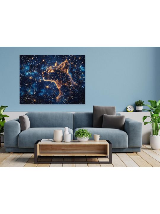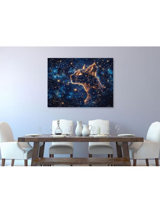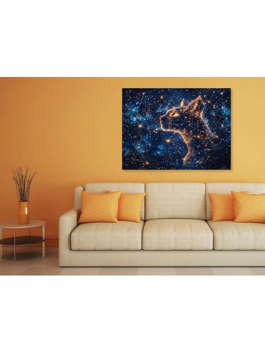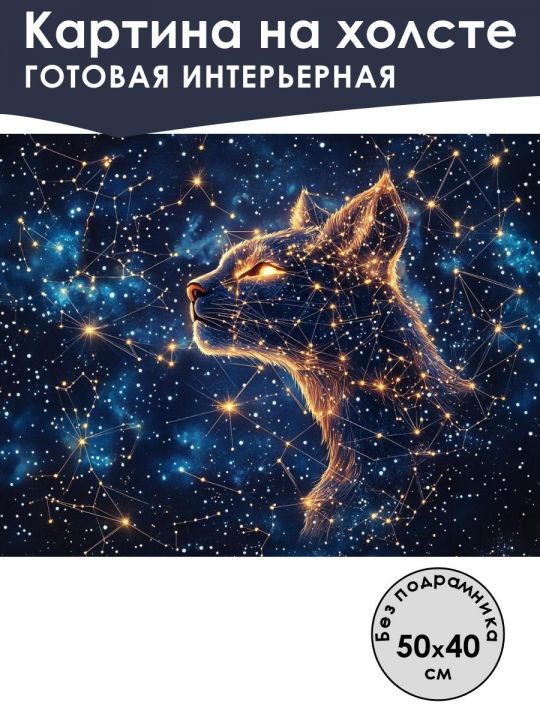 Пожалуйста обратите внимание что это интерьерная картина, не картина по номерам и не алмазная мозаика. Картина без подрамника напечатана на холсте и свернута в тубус, такую картину можно вставить в багетную или любую другую рамочку и повесить на стену. Большинство производителей используют экосольвентные краски, из-за их дешевизны - они вредны для здоровья так как в них содержится свинец, картины напечатанные на таких красках не рекомендуется вешать дома и имеют неприятный запах. Мы используем пигментные краски на водной основе японского производства они абсолютно безопасные. Напечатанная картина выглядит очень красиво, цвета яркие, НЕ выцветают много лет. Высокое качество печати. Тубус защищает картину при транспортировке, поэтому вы всегда получите её в товарном виде. Картина без подрамника и она не предназначена для натяжки на подрамник. Размер указан самой картины. Художественное изображение кошачьей головы, выполненное в виде созвездия; звёзды и светящиеся линии формируют очертания морды, ушей и шеи животного на фоне космического пространства с тёмно-синими облаками и россыпью звёзд.