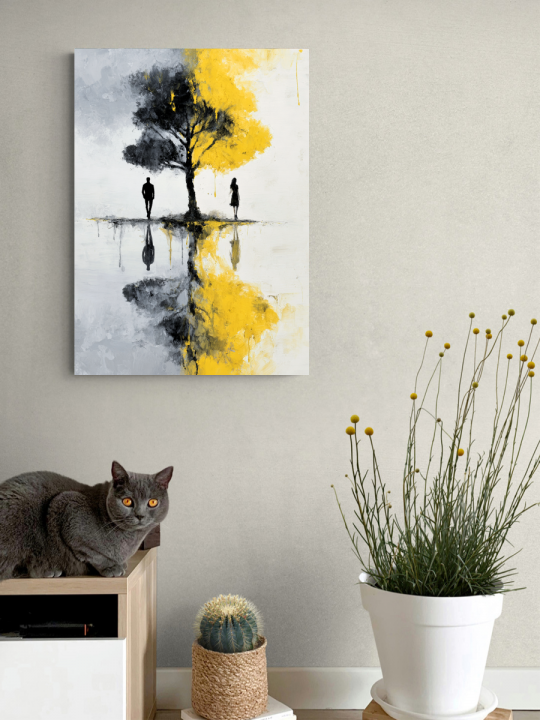 Пожалуйста обратите внимание что это интерьерная картина, не картина по номерам и не алмазная мозаика. Картина напечатана на холсте и натянута на подрамник. Подрамник крепкий, добротный , имеет специальную вставку что бы холст был всегда хорошо натянут и не проминался внутрь. Большинство производителей используют экосольвентные краски, из-за их дешевизны - они вредны для здоровья так как в них содержится свинец, картины напечатанные на таких красках не рекомендуется вешать дома и имеют неприятный запах. Мы используем пигментные краски на водной основе японского производства они абсолютно безопасные. Напечатанная картина выглядит очень красиво, цвета яркие, НЕ выцветают много лет. Высокое качество печати. Доставляется в картонной коробке, поэтому вы всегда получите её в товарном виде. Размер указан самой картины. Девушка и парень стоят по разные стороны дерева. Игра цветов, желтые и серые оттенки создают уютную и комфортную атмосферу вокруг.