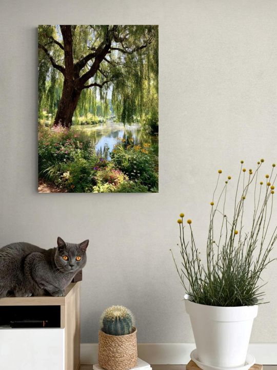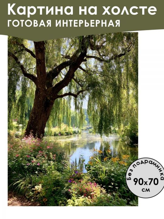 Пожалуйста обратите внимание что это интерьерная картина, не картина по номерам и не алмазная мозаика. Картина без подрамника напечатана на холсте и свернута в тубус, такую картину можно вставить в багетную или любую другую рамочку и повесить на стену. Большинство производителей используют экосольвентные краски, из-за их дешевизны - они вредны для здоровья так как в них содержится свинец, картины напечатанные на таких красках не рекомендуется вешать дома и имеют неприятный запах. Мы используем пигментные краски на водной основе японского производства они абсолютно безопасные. Напечатанная картина выглядит очень красиво, цвета яркие, НЕ выцветают много лет. Высокое качество печати. Тубус защищает картину при транспортировке, поэтому вы всегда получите её в товарном виде. Картина без подрамника и она не предназначена для натяжки на подрамник. Размер указан самой картины. Сад с пышной растительностью: на переднем плане растут разнообразные цветы, включая розовые, фиолетовые и жёлтые; в центре композиции большое раскидистое дерево с длинными свисающими ветвями, его крона бросает ажурные тени на поверхность спокойного пруда, отражающего окружающий пейзаж; в солнечных лучах всё выглядит ярко и свежо, создавая атмосферу умиротворения и природы.