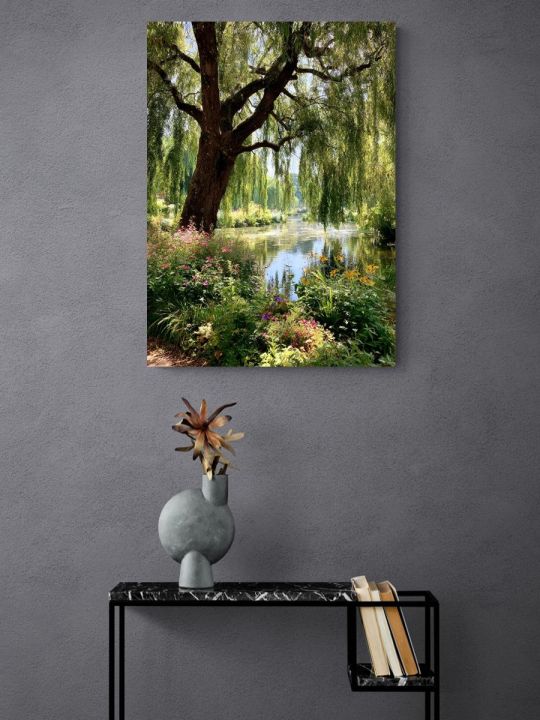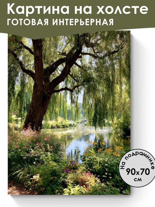 Пожалуйста обратите внимание что это интерьерная картина, не картина по номерам и не алмазная мозаика. Картина напечатана на холсте и натянута на подрамник. Подрамник крепкий, добротный , имеет специальную вставку что бы холст был всегда хорошо натянут и не проминался внутрь. Большинство производителей используют экосольвентные краски, из-за их дешевизны - они вредны для здоровья так как в них содержится свинец, картины напечатанные на таких красках не рекомендуется вешать дома и имеют неприятный запах. Мы используем пигментные краски на водной основе японского производства они абсолютно безопасные. Напечатанная картина выглядит очень красиво, цвета яркие, НЕ выцветают много лет. Высокое качество печати. Доставляется в картонной коробке, поэтому вы всегда получите её в товарном виде. Размер указан самой картины. Сад с пышной растительностью: на переднем плане растут разнообразные цветы, включая розовые, фиолетовые и жёлтые; в центре композиции большое раскидистое дерево с длинными свисающими ветвями, его крона бросает ажурные тени на поверхность спокойного пруда, отражающего окружающий пейзаж; в солнечных лучах всё выглядит ярко и свежо, создавая атмосферу умиротворения и природы.