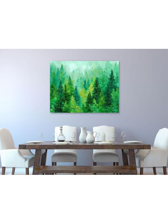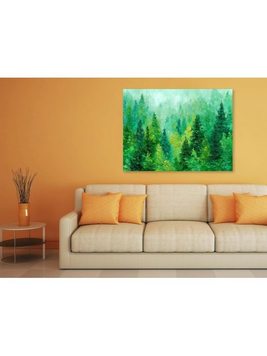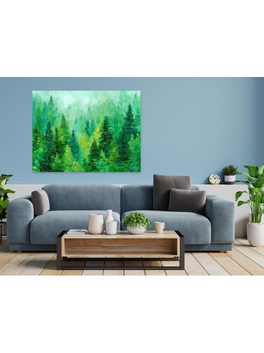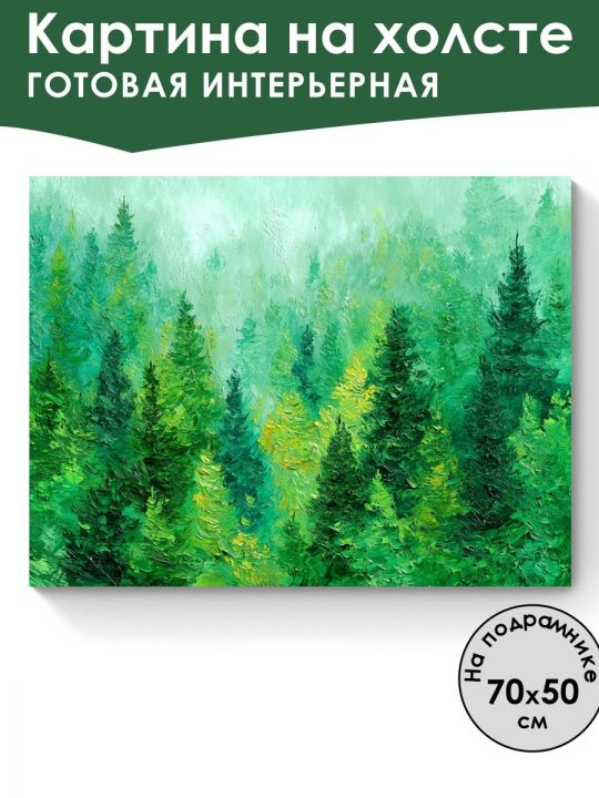 Пожалуйста обратите внимание что это интерьерная картина, не картина по номерам и не алмазная мозаика. Картина напечатана на холсте и натянута на подрамник. Подрамник крепкий, добротный , имеет специальную вставку что бы холст был всегда хорошо натянут и не проминался внутрь. Большинство производителей используют экосольвентные краски, из-за их дешевизны - они вредны для здоровья так как в них содержится свинец, картины напечатанные на таких красках не рекомендуется вешать дома и имеют неприятный запах. Мы используем пигментные краски на водной основе японского производства они абсолютно безопасные. Напечатанная картина выглядит очень красиво, цвета яркие, НЕ выцветают много лет. Высокое качество печати. Доставляется в картонной коробке, поэтому вы всегда получите её в товарном виде. Размер указан самой картины. Леса с густыми елями разных оттенков зелёного, создающими ощущение глубины и свежести, мазки краски заметны по всей поверхности, добавляя текстурность и движение, фон выполнен в светло-голубых и зелёных тонах, что создаёт иллюзию лёгкого тумана или облаков, окутывающих вершины деревьев.