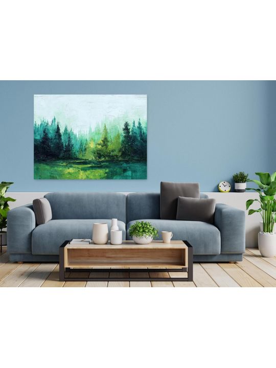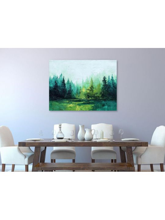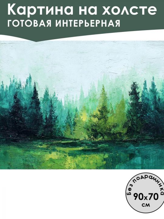 Пожалуйста обратите внимание что это интерьерная картина, не картина по номерам и не алмазная мозаика. Картина без подрамника напечатана на холсте и свернута в тубус, такую картину можно вставить в багетную или любую другую рамочку и повесить на стену. Большинство производителей используют экосольвентные краски, из-за их дешевизны - они вредны для здоровья так как в них содержится свинец, картины напечатанные на таких красках не рекомендуется вешать дома и имеют неприятный запах. Мы используем пигментные краски на водной основе японского производства они абсолютно безопасные. Напечатанная картина выглядит очень красиво, цвета яркие, НЕ выцветают много лет. Высокое качество печати. Тубус защищает картину при транспортировке, поэтому вы всегда получите её в товарном виде. Картина без подрамника и она не предназначена для натяжки на подрамник. Размер указан самой картины. Абстрактный пейзаж с густым лесом, выполненным в масле, в оттенках зелёного и бирюзового, деревья отражаются в спокойной воде, создавая ощущение уединения и тишины.
