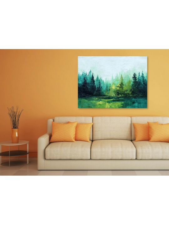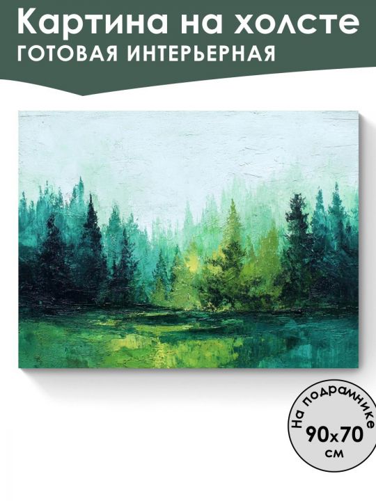 Пожалуйста обратите внимание что это интерьерная картина, не картина по номерам и не алмазная мозаика. Картина напечатана на холсте и натянута на подрамник. Подрамник крепкий, добротный , имеет специальную вставку что бы холст был всегда хорошо натянут и не проминался внутрь. Большинство производителей используют экосольвентные краски, из-за их дешевизны - они вредны для здоровья так как в них содержится свинец, картины напечатанные на таких красках не рекомендуется вешать дома и имеют неприятный запах. Мы используем пигментные краски на водной основе японского производства они абсолютно безопасные. Напечатанная картина выглядит очень красиво, цвета яркие, НЕ выцветают много лет. Высокое качество печати. Доставляется в картонной коробке, поэтому вы всегда получите её в товарном виде. Размер указан самой картины. Абстрактный пейзаж с густым лесом, выполненным в масле, в оттенках зелёного и бирюзового, деревья отражаются в спокойной воде, создавая ощущение уединения и тишины.