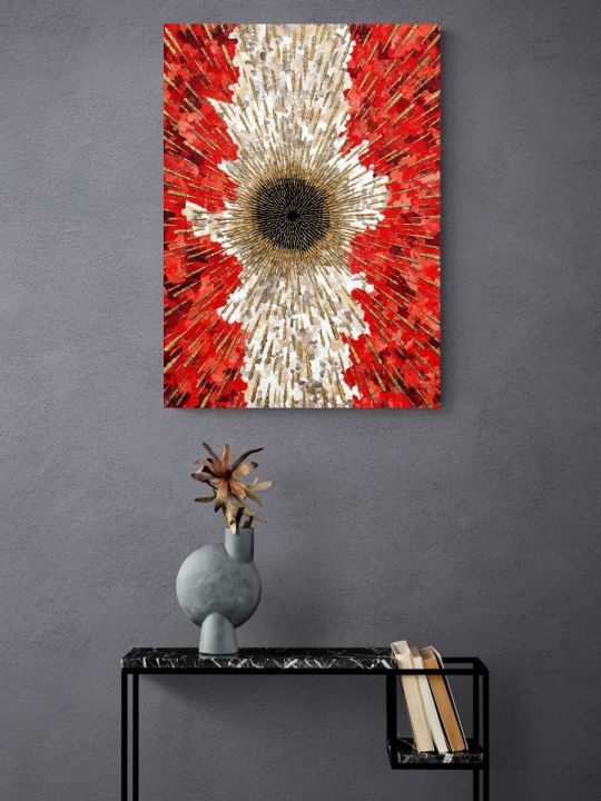 Пожалуйста обратите внимание что это интерьерная картина, не картина по номерам и не алмазная мозаика. Картина без подрамника напечатана на холсте и свернута в тубус, такую картину можно вставить в багетную или любую другую рамочку и повесить на стену. Большинство производителей используют экосольвентные краски, из-за их дешевизны - они вредны для здоровья так как в них содержится свинец, картины напечатанные на таких красках не рекомендуется вешать дома и имеют неприятный запах. Мы используем пигментные краски на водной основе японского производства они абсолютно безопасные. Напечатанная картина выглядит очень красиво, цвета яркие, НЕ выцветают много лет. Высокое качество печати. Тубус защищает картину при транспортировке, поэтому вы всегда получите её в товарном виде. Картина без подрамника и она не предназначена для натяжки на подрамник. Размер указан самой картины. Яркая абстракция с центральной точкой чёрного цвета, из которой веерообразно расходятся золотистые лучи, окружённые белыми и красными элементами, создающими динамичный эффект взрыва или расплеснувшейся краски.