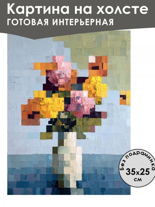 Пожалуйста обратите внимание что это интерьерная картина, не картина по номерам и не алмазная мозаика. Картина без подрамника напечатана на холсте и свернута в тубус, такую картину можно вставить в багетную или любую другую рамочку и повесить на стену. Большинство производителей используют экосольвентные краски, из-за их дешевизны - они вредны для здоровья так как в них содержится свинец, картины напечатанные на таких красках не рекомендуется вешать дома и имеют неприятный запах. Мы используем пигментные краски на водной основе японского производства они абсолютно безопасные. Напечатанная картина выглядит очень красиво, цвета яркие, НЕ выцветают много лет. Высокое качество печати. Тубус защищает картину при транспортировке, поэтому вы всегда получите её в товарном виде. Картина без подрамника и она не предназначена для натяжки на подрамник. Размер указан самой картины. Натюрморт с вазой, в которой находятся цветы различных ярких оттенков, таких как жёлтый, розовый и оранжевый; фон состоит из абстрактных цветных квадратов в голубых и зелёных тонах.