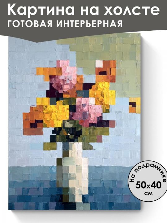 Пожалуйста обратите внимание что это интерьерная картина, не картина по номерам и не алмазная мозаика. Картина напечатана на холсте и натянута на подрамник. Подрамник крепкий, добротный , имеет специальную вставку что бы холст был всегда хорошо натянут и не проминался внутрь. Большинство производителей используют экосольвентные краски, из-за их дешевизны - они вредны для здоровья так как в них содержится свинец, картины напечатанные на таких красках не рекомендуется вешать дома и имеют неприятный запах. Мы используем пигментные краски на водной основе японского производства они абсолютно безопасные. Напечатанная картина выглядит очень красиво, цвета яркие, НЕ выцветают много лет. Высокое качество печати. Доставляется в картонной коробке, поэтому вы всегда получите её в товарном виде. Размер указан самой картины. Натюрморт с вазой, в которой находятся цветы различных ярких оттенков, таких как жёлтый, розовый и оранжевый; фон состоит из абстрактных цветных квадратов в голубых и зелёных тонах.