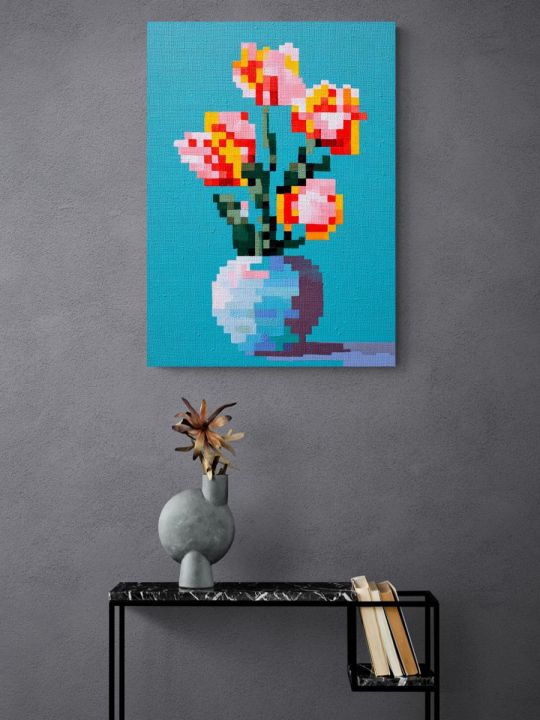 Пожалуйста обратите внимание что это интерьерная картина, не картина по номерам и не алмазная мозаика. Картина без подрамника напечатана на холсте и свернута в тубус, такую картину можно вставить в багетную или любую другую рамочку и повесить на стену. Большинство производителей используют экосольвентные краски, из-за их дешевизны - они вредны для здоровья так как в них содержится свинец, картины напечатанные на таких красках не рекомендуется вешать дома и имеют неприятный запах. Мы используем пигментные краски на водной основе японского производства они абсолютно безопасные. Напечатанная картина выглядит очень красиво, цвета яркие, НЕ выцветают много лет. Высокое качество печати. Тубус защищает картину при транспортировке, поэтому вы всегда получите её в товарном виде. Картина без подрамника и она не предназначена для натяжки на подрамник. Размер указан самой картины. Композиция из цветов в вазе на фоне ярко-бирюзового цвета: цветы состоят из комбинаций розовых, красных и жёлтых пикселей, листья и стебли выполнены в тёмно-зелёных тонах, ваза имеет голубоватый оттенок и отбрасывает тень вправо, создавая эффект объема за счёт использования различных оттенков.