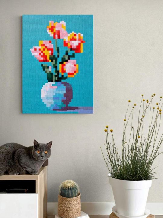Пожалуйста обратите внимание что это интерьерная картина, не картина по номерам и не алмазная мозаика. Картина напечатана на холсте и натянута на подрамник. Подрамник крепкий, добротный , имеет специальную вставку что бы холст был всегда хорошо натянут и не проминался внутрь. Большинство производителей используют экосольвентные краски, из-за их дешевизны - они вредны для здоровья так как в них содержится свинец, картины напечатанные на таких красках не рекомендуется вешать дома и имеют неприятный запах. Мы используем пигментные краски на водной основе японского производства они абсолютно безопасные. Напечатанная картина выглядит очень красиво, цвета яркие, НЕ выцветают много лет. Высокое качество печати. Доставляется в картонной коробке, поэтому вы всегда получите её в товарном виде. Размер указан самой картины. Композиция из цветов в вазе на фоне ярко-бирюзового цвета: цветы состоят из комбинаций розовых, красных и жёлтых пикселей, листья и стебли выполнены в тёмно-зелёных тонах, ваза имеет голубоватый оттенок и отбрасывает тень вправо, создавая эффект объема за счёт использования различных оттенков.