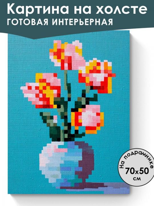 Пожалуйста обратите внимание что это интерьерная картина, не картина по номерам и не алмазная мозаика. Картина напечатана на холсте и натянута на подрамник. Подрамник крепкий, добротный , имеет специальную вставку что бы холст был всегда хорошо натянут и не проминался внутрь. Большинство производителей используют экосольвентные краски, из-за их дешевизны - они вредны для здоровья так как в них содержится свинец, картины напечатанные на таких красках не рекомендуется вешать дома и имеют неприятный запах. Мы используем пигментные краски на водной основе японского производства они абсолютно безопасные. Напечатанная картина выглядит очень красиво, цвета яркие, НЕ выцветают много лет. Высокое качество печати. Доставляется в картонной коробке, поэтому вы всегда получите её в товарном виде. Размер указан самой картины. Композиция из цветов в вазе на фоне ярко-бирюзового цвета: цветы состоят из комбинаций розовых, красных и жёлтых пикселей, листья и стебли выполнены в тёмно-зелёных тонах, ваза имеет голубоватый оттенок и отбрасывает тень вправо, создавая эффект объема за счёт использования различных оттенков.