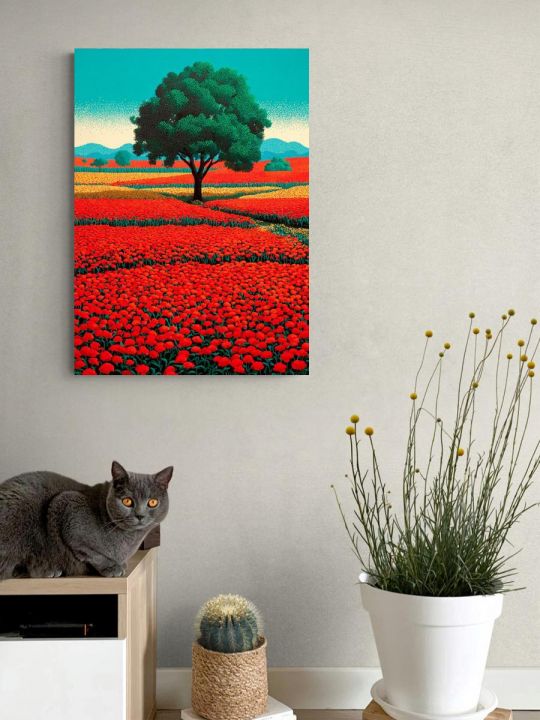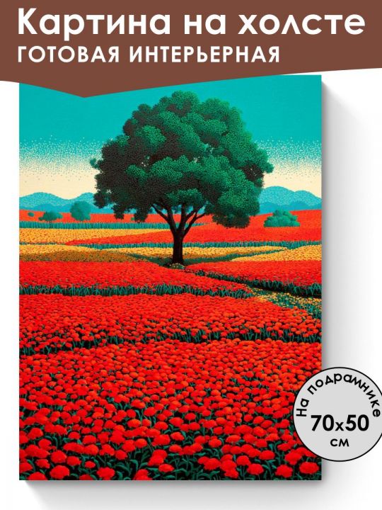 Пожалуйста обратите внимание что это интерьерная картина, не картина по номерам и не алмазная мозаика. Картина напечатана на холсте и натянута на подрамник. Подрамник крепкий, добротный , имеет специальную вставку что бы холст был всегда хорошо натянут и не проминался внутрь. Большинство производителей используют экосольвентные краски, из-за их дешевизны - они вредны для здоровья так как в них содержится свинец, картины напечатанные на таких красках не рекомендуется вешать дома и имеют неприятный запах. Мы используем пигментные краски на водной основе японского производства они абсолютно безопасные. Напечатанная картина выглядит очень красиво, цвета яркие, НЕ выцветают много лет. Высокое качество печати. Доставляется в картонной коробке, поэтому вы всегда получите её в товарном виде. Размер указан самой картины. Пышное зелёное дерево, стоящее посреди поля с яркими красными и жёлтыми цветами; на горизонте возвышаются голубые холмы, и всё окружено насыщенным бирюзовым небом.