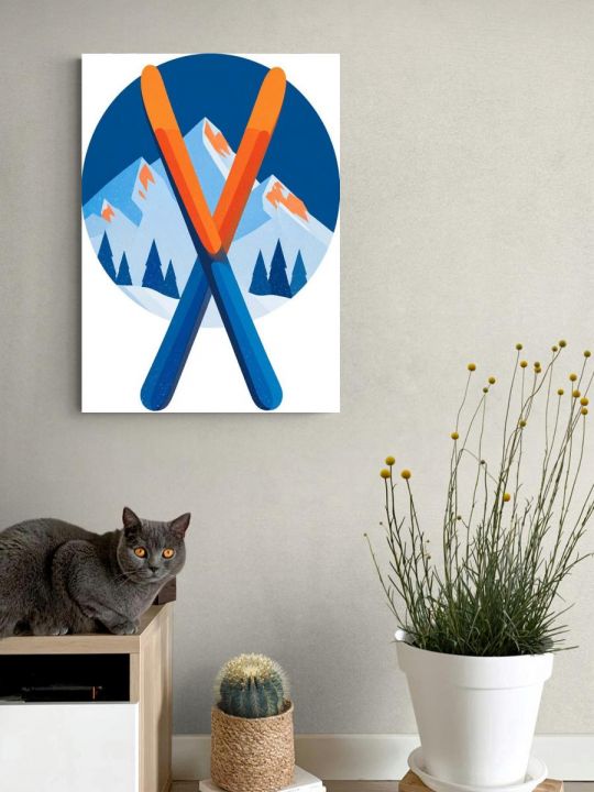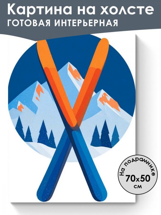 Пожалуйста обратите внимание что это интерьерная картина, не картина по номерам и не алмазная мозаика. Картина напечатана на холсте и натянута на подрамник. Подрамник крепкий, добротный , имеет специальную вставку что бы холст был всегда хорошо натянут и не проминался внутрь. Большинство производителей используют экосольвентные краски, из-за их дешевизны - они вредны для здоровья так как в них содержится свинец, картины напечатанные на таких красках не рекомендуется вешать дома и имеют неприятный запах. Мы используем пигментные краски на водной основе японского производства они абсолютно безопасные. Напечатанная картина выглядит очень красиво, цвета яркие, НЕ выцветают много лет. Высокое качество печати. Доставляется в картонной коробке, поэтому вы всегда получите её в товарном виде. Размер указан самой картины. Иллюстрация с изображением двух перекрещенных лыж ярких оранжевого и синего цветов на фоне круглой эмблемы с изображением заснеженных гор и елей, выполненная в минималистичном стиле с использованием насыщенных оттенков синего и оранжевого.