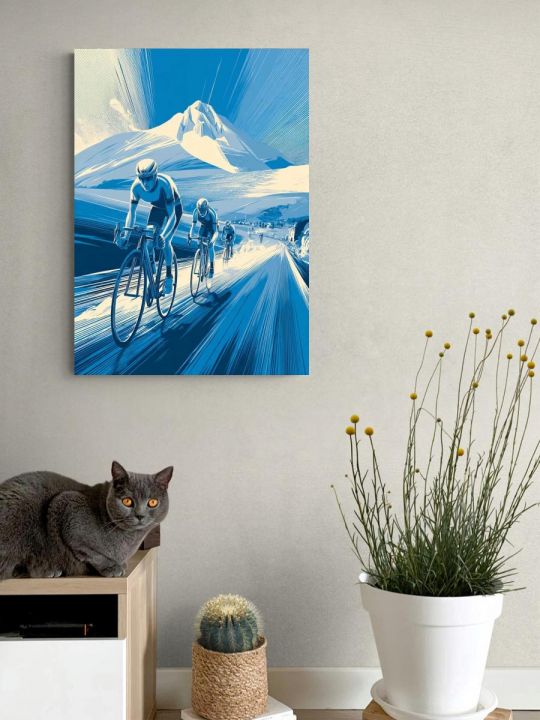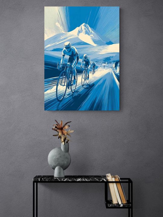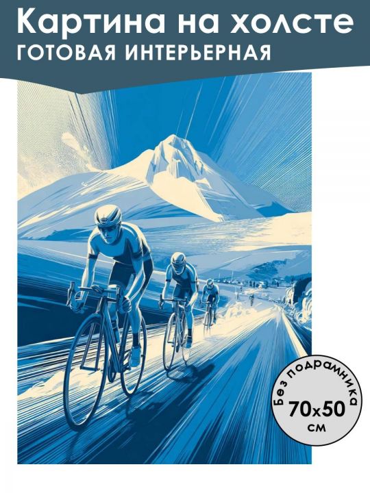 Пожалуйста обратите внимание что это интерьерная картина, не картина по номерам и не алмазная мозаика. Картина без подрамника напечатана на холсте и свернута в тубус, такую картину можно вставить в багетную или любую другую рамочку и повесить на стену. Большинство производителей используют экосольвентные краски, из-за их дешевизны - они вредны для здоровья так как в них содержится свинец, картины напечатанные на таких красках не рекомендуется вешать дома и имеют неприятный запах. Мы используем пигментные краски на водной основе японского производства они абсолютно безопасные. Напечатанная картина выглядит очень красиво, цвета яркие, НЕ выцветают много лет. Высокое качество печати. Тубус защищает картину при транспортировке, поэтому вы всегда получите её в товарном виде. Картина без подрамника и она не предназначена для натяжки на подрамник. Размер указан самой картины. На изображении три велосипедиста в шлемах едут по извилистой дороге на фоне величественной горы; картина выполнена в синей гамме с динамичными линиями, подчеркивающими скорость и движение, создавая ощущение стремительности и энергии окружающей природы.
