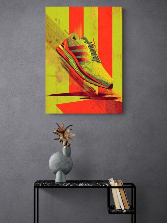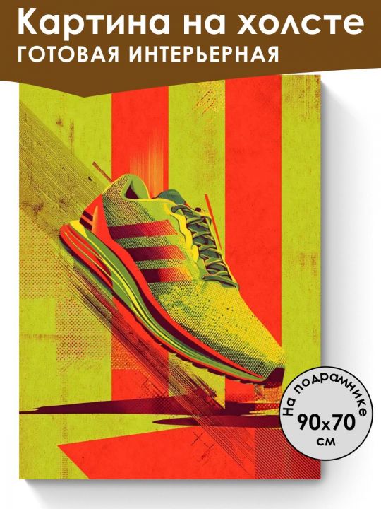 Пожалуйста обратите внимание что это интерьерная картина, не картина по номерам и не алмазная мозаика. Картина напечатана на холсте и натянута на подрамник. Подрамник крепкий, добротный , имеет специальную вставку что бы холст был всегда хорошо натянут и не проминался внутрь. Большинство производителей используют экосольвентные краски, из-за их дешевизны - они вредны для здоровья так как в них содержится свинец, картины напечатанные на таких красках не рекомендуется вешать дома и имеют неприятный запах. Мы используем пигментные краски на водной основе японского производства они абсолютно безопасные. Напечатанная картина выглядит очень красиво, цвета яркие, НЕ выцветают много лет. Высокое качество печати. Доставляется в картонной коробке, поэтому вы всегда получите её в товарном виде. Размер указан самой картины. На изображении яркий кроссовок выполнен в неоново-зелёных, красных и жёлтых тонах, на фоне с полосами и эффектом движения, что придаёт ему современный и динамичный вид; кроссовок украшен тремя полосками сбоку и имеет текстурную поверхность.