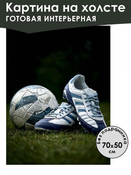 Пожалуйста обратите внимание что это интерьерная картина, не картина по номерам и не алмазная мозаика. Картина без подрамника напечатана на холсте и свернута в тубус, такую картину можно вставить в багетную или любую другую рамочку и повесить на стену. Большинство производителей используют экосольвентные краски, из-за их дешевизны - они вредны для здоровья так как в них содержится свинец, картины напечатанные на таких красках не рекомендуется вешать дома и имеют неприятный запах. Мы используем пигментные краски на водной основе японского производства они абсолютно безопасные. Напечатанная картина выглядит очень красиво, цвета яркие, НЕ выцветают много лет. Высокое качество печати. Тубус защищает картину при транспортировке, поэтому вы всегда получите её в товарном виде. Картина без подрамника и она не предназначена для натяжки на подрамник. Размер указан самой картины. На изображении пара футбольных бутс сине-белого цвета лежит рядом с легка потрёпанным футбольным мячом на травяном поле.