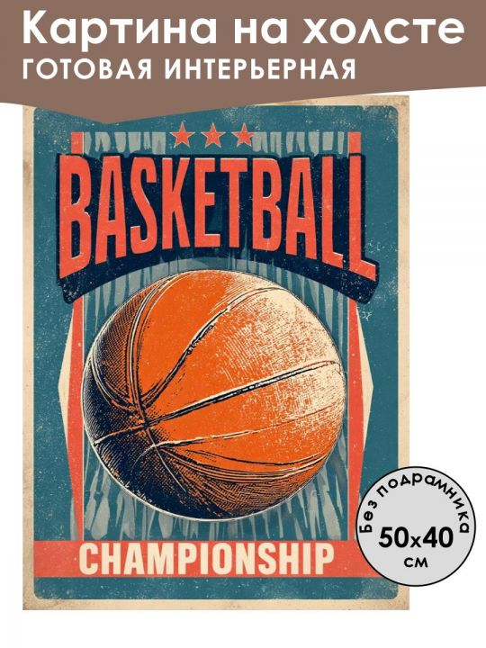Пожалуйста обратите внимание что это интерьерная картина, не картина по номерам и не алмазная мозаика. Картина без подрамника напечатана на холсте и свернута в тубус, такую картину можно вставить в багетную или любую другую рамочку и повесить на стену. Большинство производителей используют экосольвентные краски, из-за их дешевизны - они вредны для здоровья так как в них содержится свинец, картины напечатанные на таких красках не рекомендуется вешать дома и имеют неприятный запах. Мы используем пигментные краски на водной основе японского производства они абсолютно безопасные. Напечатанная картина выглядит очень красиво, цвета яркие, НЕ выцветают много лет. Высокое качество печати. Тубус защищает картину при транспортировке, поэтому вы всегда получите её в товарном виде. Картина без подрамника и она не предназначена для натяжки на подрамник. Размер указан самой картины. Постер, выполненный в винтажном стиле, рекламирует баскетбольный чемпионат; в центре изображён ярко-оранжевый баскетбольный мяч, а над и под ним большие надписи "BASKETBALL" и "CHAMPIONSHIP" соответственно, на фоне синих и красных полос с тремя звездами сверху.