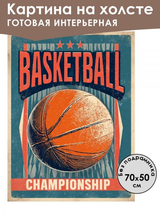 Пожалуйста обратите внимание что это интерьерная картина, не картина по номерам и не алмазная мозаика. Картина без подрамника напечатана на холсте и свернута в тубус, такую картину можно вставить в багетную или любую другую рамочку и повесить на стену. Большинство производителей используют экосольвентные краски, из-за их дешевизны - они вредны для здоровья так как в них содержится свинец, картины напечатанные на таких красках не рекомендуется вешать дома и имеют неприятный запах. Мы используем пигментные краски на водной основе японского производства они абсолютно безопасные. Напечатанная картина выглядит очень красиво, цвета яркие, НЕ выцветают много лет. Высокое качество печати. Тубус защищает картину при транспортировке, поэтому вы всегда получите её в товарном виде. Картина без подрамника и она не предназначена для натяжки на подрамник. Размер указан самой картины. Постер, выполненный в винтажном стиле, рекламирует баскетбольный чемпионат; в центре изображён ярко-оранжевый баскетбольный мяч, а над и под ним большие надписи "BASKETBALL" и "CHAMPIONSHIP" соответственно, на фоне синих и красных полос с тремя звездами сверху.