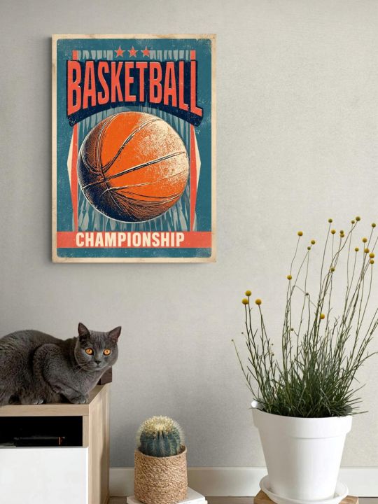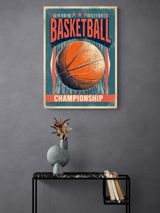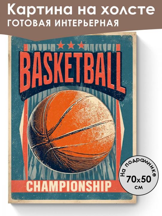 Пожалуйста обратите внимание что это интерьерная картина, не картина по номерам и не алмазная мозаика. Картина напечатана на холсте и натянута на подрамник. Подрамник крепкий, добротный , имеет специальную вставку что бы холст был всегда хорошо натянут и не проминался внутрь. Большинство производителей используют экосольвентные краски, из-за их дешевизны - они вредны для здоровья так как в них содержится свинец, картины напечатанные на таких красках не рекомендуется вешать дома и имеют неприятный запах. Мы используем пигментные краски на водной основе японского производства они абсолютно безопасные. Напечатанная картина выглядит очень красиво, цвета яркие, НЕ выцветают много лет. Высокое качество печати. Доставляется в картонной коробке, поэтому вы всегда получите её в товарном виде. Размер указан самой картины. Постер, выполненный в винтажном стиле, рекламирует баскетбольный чемпионат; в центре изображён ярко-оранжевый баскетбольный мяч, а над и под ним большие надписи "BASKETBALL" и "CHAMPIONSHIP" соответственно, на фоне синих и красных полос с тремя звездами сверху.