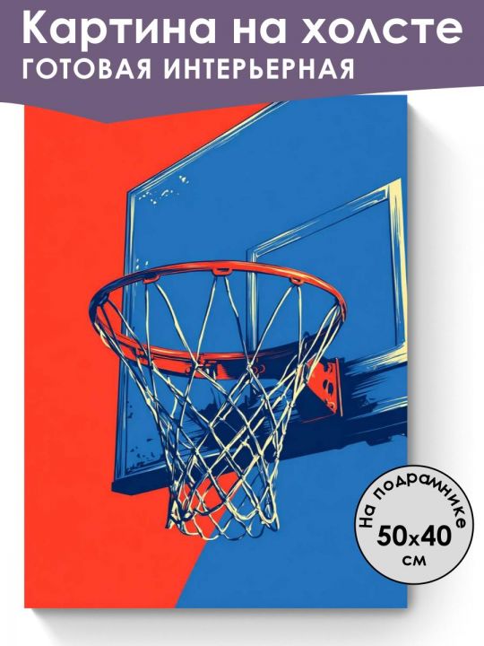Пожалуйста обратите внимание что это интерьерная картина, не картина по номерам и не алмазная мозаика. Картина напечатана на холсте и натянута на подрамник. Подрамник крепкий, добротный , имеет специальную вставку что бы холст был всегда хорошо натянут и не проминался внутрь. Большинство производителей используют экосольвентные краски, из-за их дешевизны - они вредны для здоровья так как в них содержится свинец, картины напечатанные на таких красках не рекомендуется вешать дома и имеют неприятный запах. Мы используем пигментные краски на водной основе японского производства они абсолютно безопасные. Напечатанная картина выглядит очень красиво, цвета яркие, НЕ выцветают много лет. Высокое качество печати. Доставляется в картонной коробке, поэтому вы всегда получите её в товарном виде. Размер указан самой картины. Баскетбольное кольцо с сеткой изображено на абстрактном фоне ярко-красного и синего цветов, создавая контраст и акцентируя внимание на спортивном элементе в стилизованной графической манере.