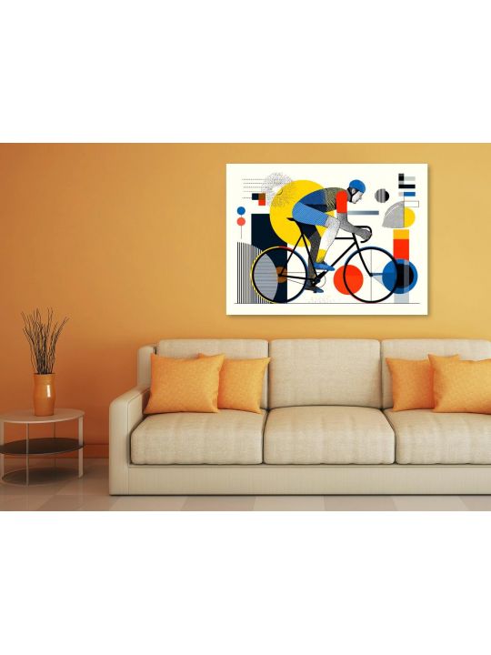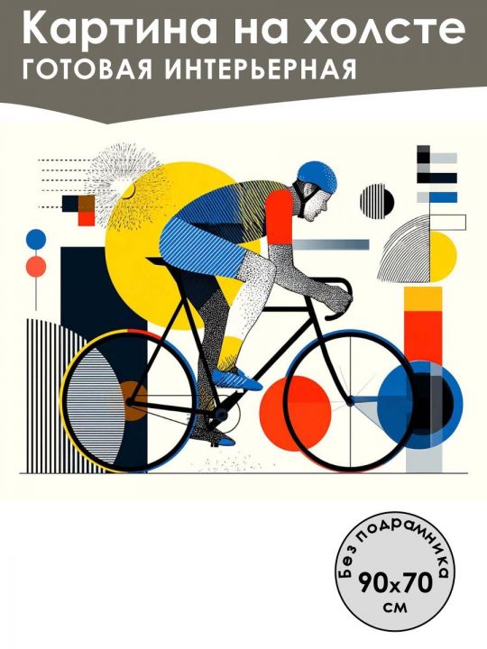 Пожалуйста обратите внимание что это интерьерная картина, не картина по номерам и не алмазная мозаика. Картина без подрамника напечатана на холсте и свернута в тубус, такую картину можно вставить в багетную или любую другую рамочку и повесить на стену. Большинство производителей используют экосольвентные краски, из-за их дешевизны - они вредны для здоровья так как в них содержится свинец, картины напечатанные на таких красках не рекомендуется вешать дома и имеют неприятный запах. Мы используем пигментные краски на водной основе японского производства они абсолютно безопасные. Напечатанная картина выглядит очень красиво, цвета яркие, НЕ выцветают много лет. Высокое качество печати. Тубус защищает картину при транспортировке, поэтому вы всегда получите её в товарном виде. Картина без подрамника и она не предназначена для натяжки на подрамник. Размер указан самой картины. Иллюстрация изображает велосипедиста в шлеме на абстрактном фоне с яркими геометрическими фигурами, включая круги, линии и квадраты, в черных, синих, желтых и красных цветах, создавая динамичную и энергичную композицию.