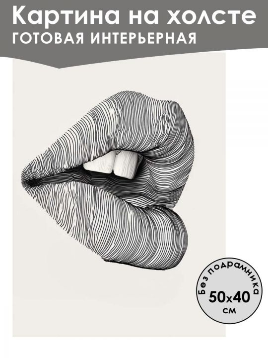 Пожалуйста обратите внимание что это интерьерная картина, не картина по номерам и не алмазная мозаика. Картина без подрамника напечатана на холсте и свернута в тубус, такую картину можно вставить в багетную или любую другую рамочку и повесить на стену. Большинство производителей используют экосольвентные краски, из-за их дешевизны - они вредны для здоровья так как в них содержится свинец, картины напечатанные на таких красках не рекомендуется вешать дома и имеют неприятный запах. Мы используем пигментные краски на водной основе японского производства они абсолютно безопасные. Напечатанная картина выглядит очень красиво, цвета яркие, НЕ выцветают много лет. Высокое качество печати. Тубус защищает картину при транспортировке, поэтому вы всегда получите её в товарном виде. Картина без подрамника и она не предназначена для натяжки на подрамник. Размер указан самой картины. На изображении губы, выполненные в стиле иллюстрации с использованием тонких черных линий, создающих текстурированный эффект; линии изгибаются по форме губ, задняя часть приоткрыта и видны зубы, фон однотонный.