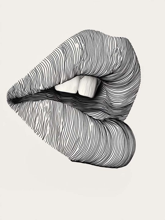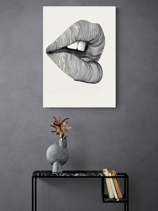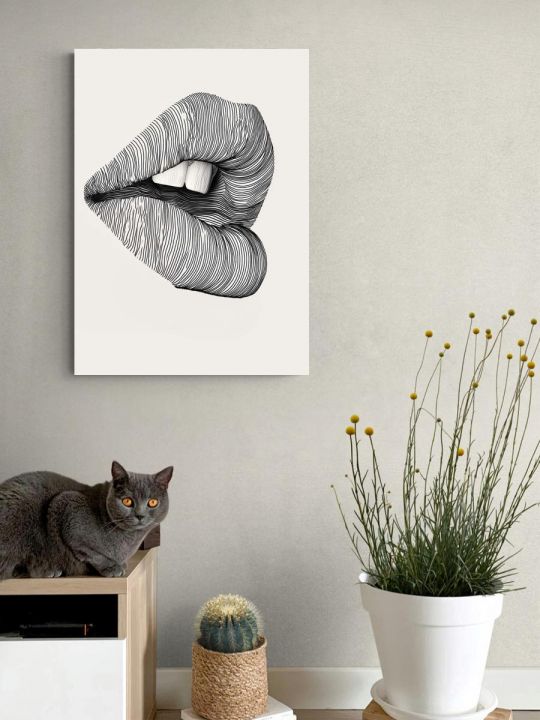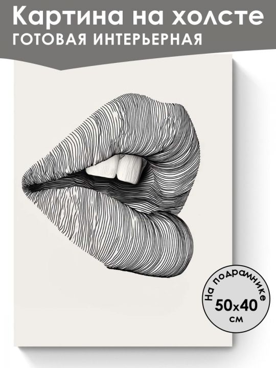 Пожалуйста обратите внимание что это интерьерная картина, не картина по номерам и не алмазная мозаика. Картина напечатана на холсте и натянута на подрамник. Подрамник крепкий, добротный , имеет специальную вставку что бы холст был всегда хорошо натянут и не проминался внутрь. Большинство производителей используют экосольвентные краски, из-за их дешевизны - они вредны для здоровья так как в них содержится свинец, картины напечатанные на таких красках не рекомендуется вешать дома и имеют неприятный запах. Мы используем пигментные краски на водной основе японского производства они абсолютно безопасные. Напечатанная картина выглядит очень красиво, цвета яркие, НЕ выцветают много лет. Высокое качество печати. Доставляется в картонной коробке, поэтому вы всегда получите её в товарном виде. Размер указан самой картины. На изображении губы, выполненные в стиле иллюстрации с использованием тонких черных линий, создающих текстурированный эффект; линии изгибаются по форме губ, задняя часть приоткрыта и видны зубы, фон однотонный.
