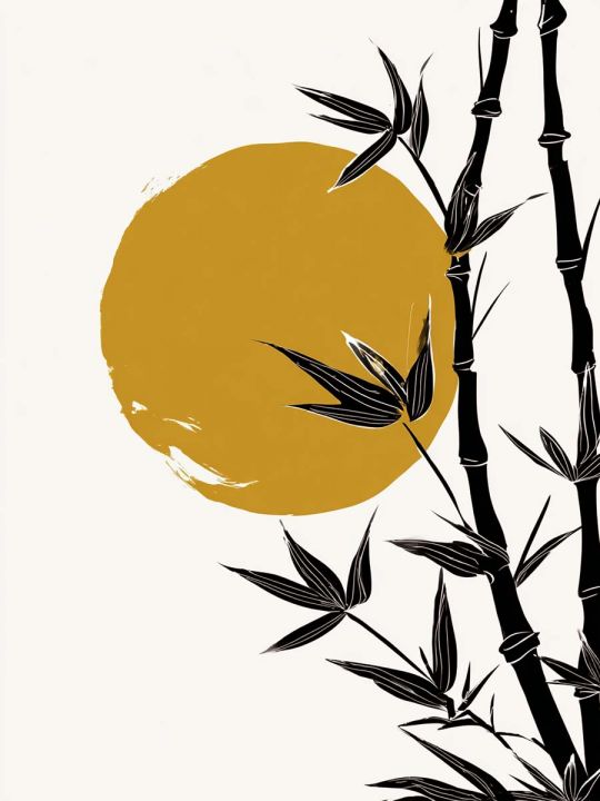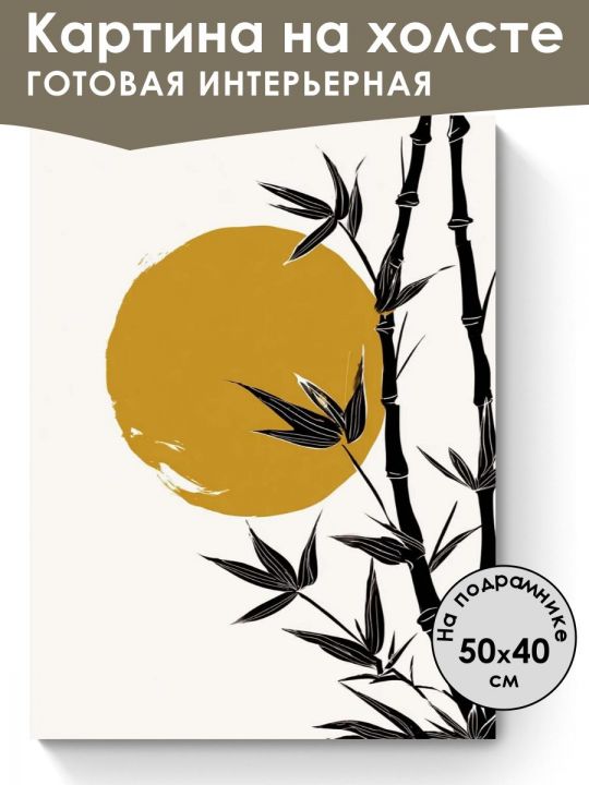 Пожалуйста обратите внимание что это интерьерная картина, не картина по номерам и не алмазная мозаика. Картина напечатана на холсте и натянута на подрамник. Подрамник крепкий, добротный , имеет специальную вставку что бы холст был всегда хорошо натянут и не проминался внутрь. Большинство производителей используют экосольвентные краски, из-за их дешевизны - они вредны для здоровья так как в них содержится свинец, картины напечатанные на таких красках не рекомендуется вешать дома и имеют неприятный запах. Мы используем пигментные краски на водной основе японского производства они абсолютно безопасные. Напечатанная картина выглядит очень красиво, цвета яркие, НЕ выцветают много лет. Высокое качество печати. Доставляется в картонной коробке, поэтому вы всегда получите её в товарном виде. Размер указан самой картины. Изображение представляет собой минималистичную иллюстрацию с черными бамбуковыми стеблями и листьями на фоне ярко-оранжевого круга, символизирующего солнце, на светлом фоне.