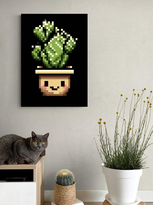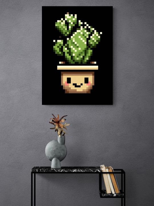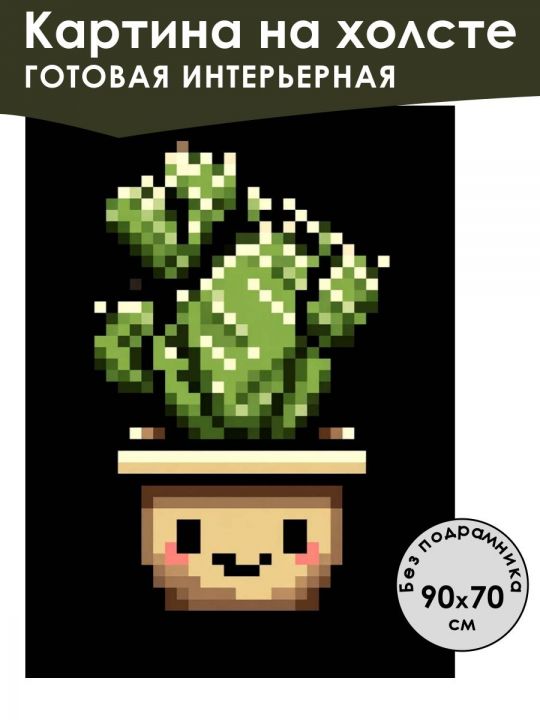 Пожалуйста обратите внимание что это интерьерная картина, не картина по номерам и не алмазная мозаика. Картина без подрамника напечатана на холсте и свернута в тубус, такую картину можно вставить в багетную или любую другую рамочку и повесить на стену. Большинство производителей используют экосольвентные краски, из-за их дешевизны - они вредны для здоровья так как в них содержится свинец, картины напечатанные на таких красках не рекомендуется вешать дома и имеют неприятный запах. Мы используем пигментные краски на водной основе японского производства они абсолютно безопасные. Напечатанная картина выглядит очень красиво, цвета яркие, НЕ выцветают много лет. Высокое качество печати. Тубус защищает картину при транспортировке, поэтому вы всегда получите её в товарном виде. Картина без подрамника и она не предназначена для натяжки на подрамник. Размер указан самой картины. Изображение показывает милый пиксельный рисунок цветочного горшка с улыбающимся лицом, яркими щеками и зелёным растением сверху, выполненное в ретро стиле пиксель-арта на чёрном фоне.