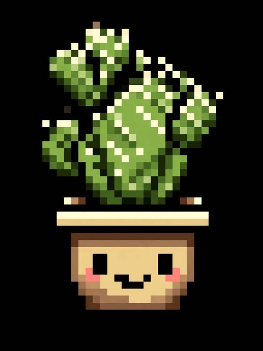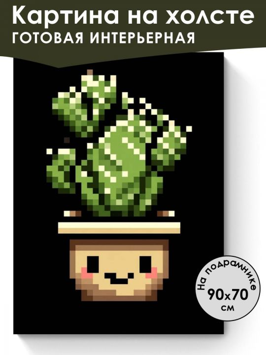 Пожалуйста обратите внимание что это интерьерная картина, не картина по номерам и не алмазная мозаика. Картина напечатана на холсте и натянута на подрамник. Подрамник крепкий, добротный , имеет специальную вставку что бы холст был всегда хорошо натянут и не проминался внутрь. Большинство производителей используют экосольвентные краски, из-за их дешевизны - они вредны для здоровья так как в них содержится свинец, картины напечатанные на таких красках не рекомендуется вешать дома и имеют неприятный запах. Мы используем пигментные краски на водной основе японского производства они абсолютно безопасные. Напечатанная картина выглядит очень красиво, цвета яркие, НЕ выцветают много лет. Высокое качество печати. Доставляется в картонной коробке, поэтому вы всегда получите её в товарном виде. Размер указан самой картины. Изображение показывает милый пиксельный рисунок цветочного горшка с улыбающимся лицом, яркими щеками и зелёным растением сверху, выполненное в ретро стиле пиксель-арта на чёрном фоне.