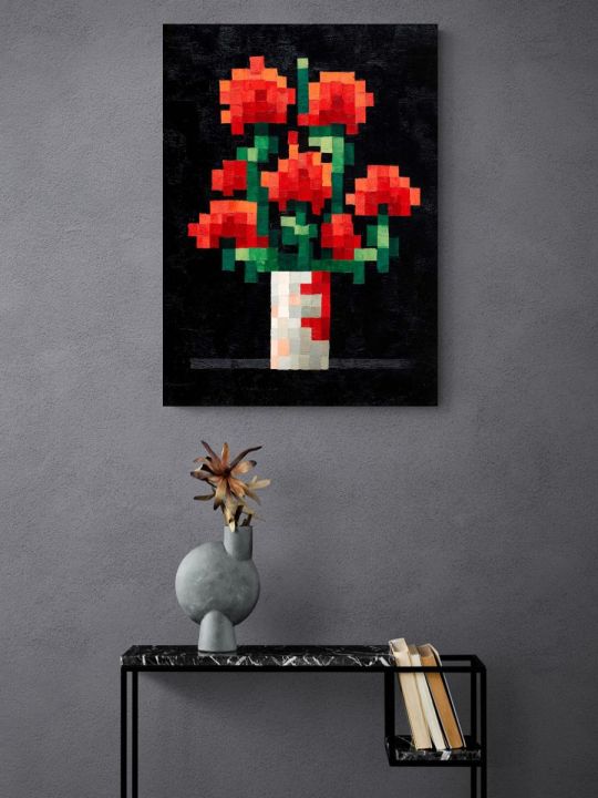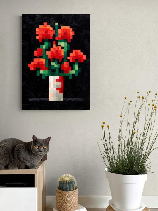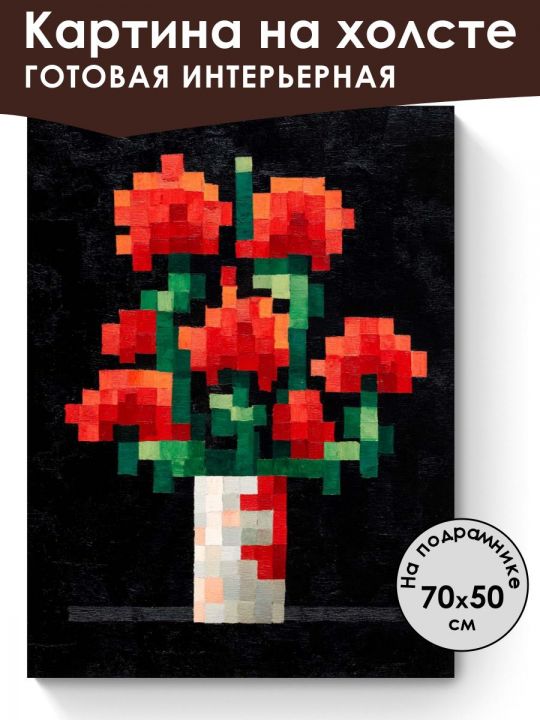 Пожалуйста обратите внимание что это интерьерная картина, не картина по номерам и не алмазная мозаика. Картина напечатана на холсте и натянута на подрамник. Подрамник крепкий, добротный , имеет специальную вставку что бы холст был всегда хорошо натянут и не проминался внутрь. Большинство производителей используют экосольвентные краски, из-за их дешевизны - они вредны для здоровья так как в них содержится свинец, картины напечатанные на таких красках не рекомендуется вешать дома и имеют неприятный запах. Мы используем пигментные краски на водной основе японского производства они абсолютно безопасные. Напечатанная картина выглядит очень красиво, цвета яркие, НЕ выцветают много лет. Высокое качество печати. Доставляется в картонной коробке, поэтому вы всегда получите её в товарном виде. Размер указан самой картины. Изображение представляет собой пиксельное искусство, изображающее букет ярко-красных цветов в белой вазе с оттенками зелёных стеблей, на тёмном фоне.
