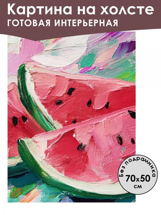 Пожалуйста обратите внимание что это интерьерная картина, не картина по номерам и не алмазная мозаика. Картина без подрамника напечатана на холсте и свернута в тубус, такую картину можно вставить в багетную или любую другую рамочку и повесить на стену. Большинство производителей используют экосольвентные краски, из-за их дешевизны - они вредны для здоровья так как в них содержится свинец, картины напечатанные на таких красках не рекомендуется вешать дома и имеют неприятный запах. Мы используем пигментные краски на водной основе японского производства они абсолютно безопасные. Напечатанная картина выглядит очень красиво, цвета яркие, НЕ выцветают много лет. Высокое качество печати. Тубус защищает картину при транспортировке, поэтому вы всегда получите её в товарном виде. Картина без подрамника и она не предназначена для натяжки на подрамник. Размер указан самой картины. На картине изображены сочные ломтики арбуза с чёрными семечками и зелёной коркой, выполненные масляными красками на холсте; текстура мазков создаёт объём и добавляет реалистичности, окружённые абстрактными разноцветными мазками, придающими композиции динамику и яркость.