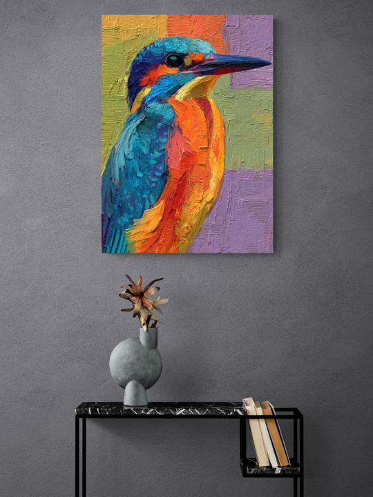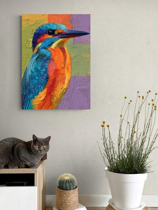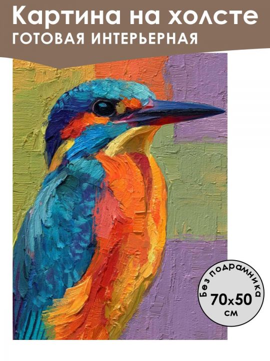 Пожалуйста обратите внимание что это интерьерная картина, не картина по номерам и не алмазная мозаика. Картина без подрамника напечатана на холсте и свернута в тубус, такую картину можно вставить в багетную или любую другую рамочку и повесить на стену. Большинство производителей используют экосольвентные краски, из-за их дешевизны - они вредны для здоровья так как в них содержится свинец, картины напечатанные на таких красках не рекомендуется вешать дома и имеют неприятный запах. Мы используем пигментные краски на водной основе японского производства они абсолютно безопасные. Напечатанная картина выглядит очень красиво, цвета яркие, НЕ выцветают много лет. Высокое качество печати. Тубус защищает картину при транспортировке, поэтому вы всегда получите её в товарном виде. Картина без подрамника и она не предназначена для натяжки на подрамник. Размер указан самой картины. На изображении запечатлён красочный портрет птицы, выполненный в технике масляной живописи, с использованием ярких цветов — синих, оранжевых, красных и жёлтых — на абстрактном фоне в тёплых и холодных тонах; текстура мазков подчёркивает динамичность и живость изображённой сцены.