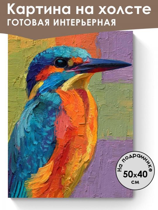 Пожалуйста обратите внимание что это интерьерная картина, не картина по номерам и не алмазная мозаика. Картина напечатана на холсте и натянута на подрамник. Подрамник крепкий, добротный , имеет специальную вставку что бы холст был всегда хорошо натянут и не проминался внутрь. Большинство производителей используют экосольвентные краски, из-за их дешевизны - они вредны для здоровья так как в них содержится свинец, картины напечатанные на таких красках не рекомендуется вешать дома и имеют неприятный запах. Мы используем пигментные краски на водной основе японского производства они абсолютно безопасные. Напечатанная картина выглядит очень красиво, цвета яркие, НЕ выцветают много лет. Высокое качество печати. Доставляется в картонной коробке, поэтому вы всегда получите её в товарном виде. Размер указан самой картины. На изображении запечатлён красочный портрет птицы, выполненный в технике масляной живописи, с использованием ярких цветов — синих, оранжевых, красных и жёлтых — на абстрактном фоне в тёплых и холодных тонах; текстура мазков подчёркивает динамичность и живость изображённой сцены.