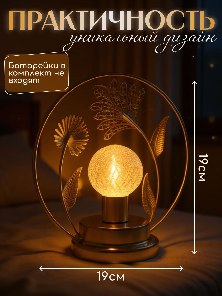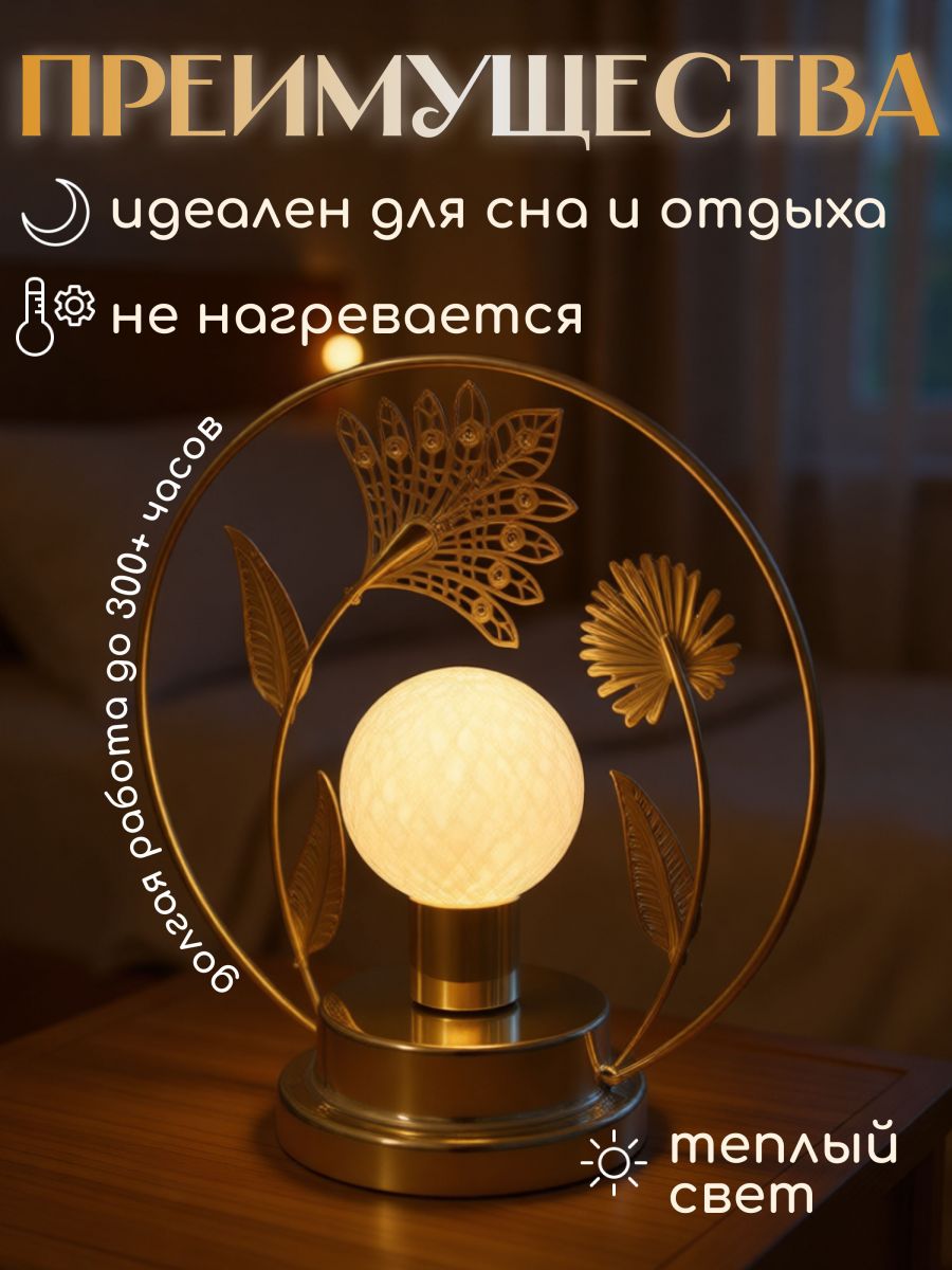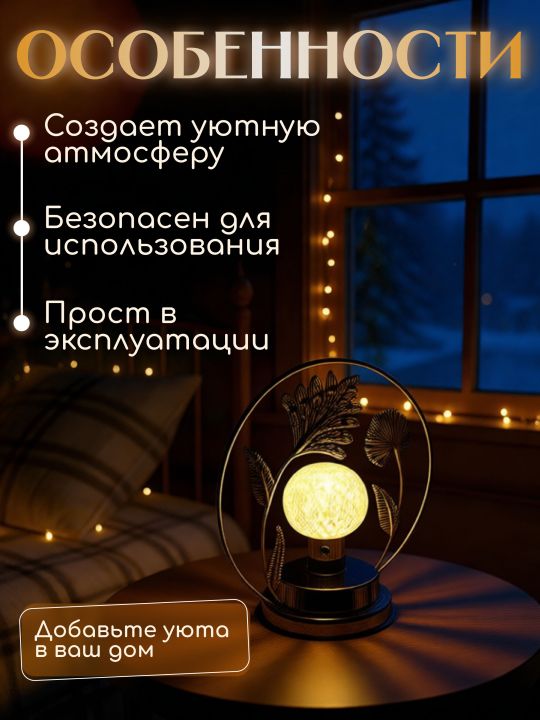 Элегантный ночник с тёплым мягким светом, изящным металлическим декором в виде цветов и листьев и автономной работой от батареек — создаёт уют, атмосферу спокойствия и стильный акцент в интерьере, особенно вечером, когда дом переходит в режим "Релакс".