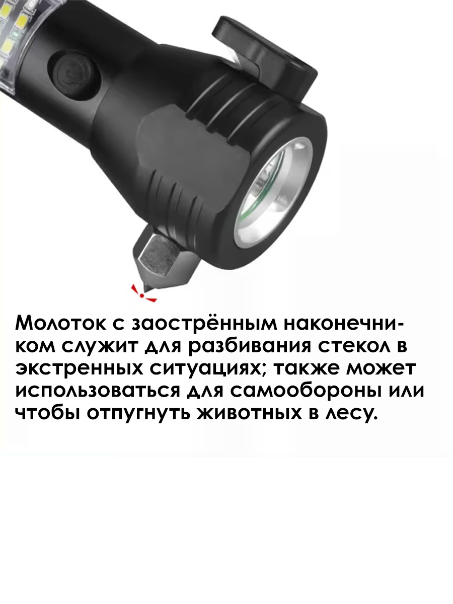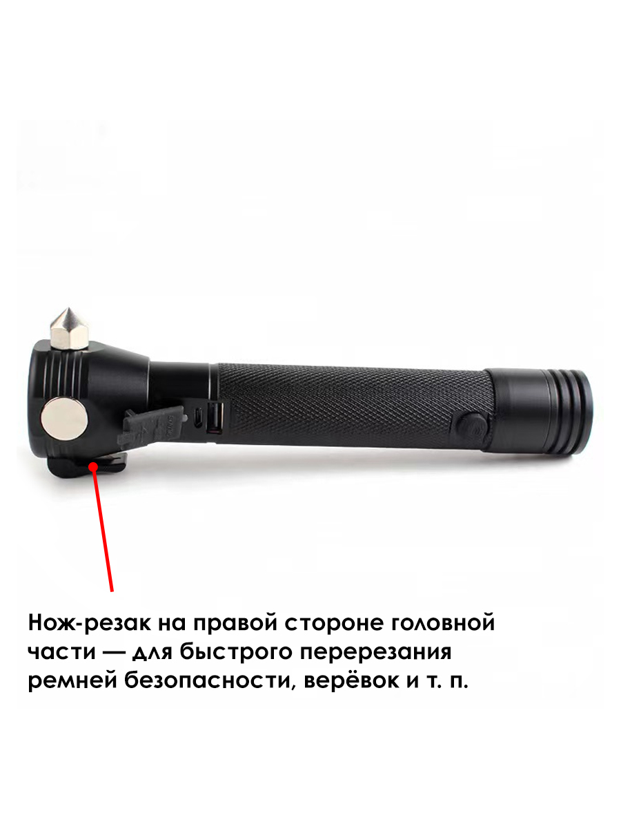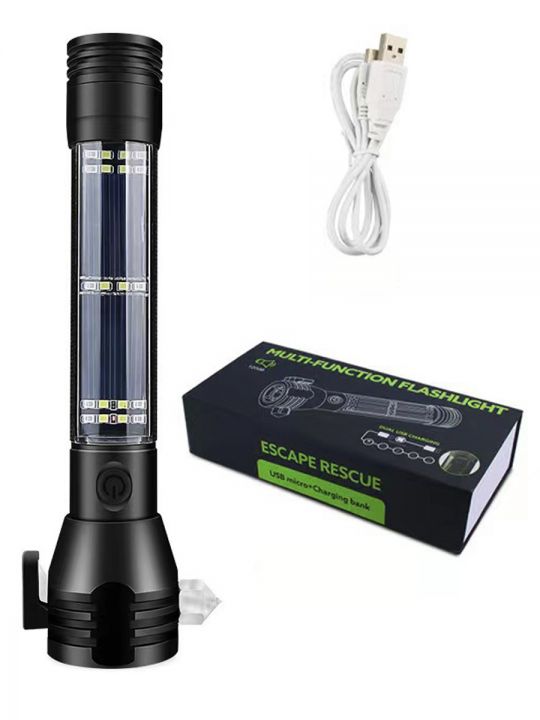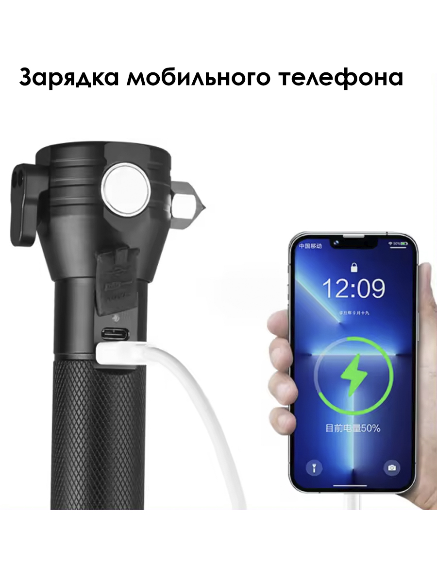 Многофункциональный фонарь 12 в 1 сочетает в себе передний и боковой свет с режимами белого, красного и синего свечения, встроенную солнечную панель и разъём Type-C для зарядки, функцию пауэрбанка через USB-выход, молоток для разбивания стекла, нож-резак для ремней и верёвок, динамик с сиреной громкостью 120 дБ для подачи сигнала SOS или отпугивания животных, мощный магнит для крепления к металлическим поверхностям, а также свисток и предохранитель от случайного включения. Мощность переднего света: T6 LED 10 Вт, дальность до 200 м. Режимы переднего света: 100%, 50%, стробоскоп. Боковой свет: 10×SMD белый, красно-синий маяк. Аккумулятор: Li-ion 18650, ёмкость 1500 mAh. Зарядка: солнечная панель 5V 50 mA, разъём Type-C. Функция: пауэрбанк через USB-выход. Сирена: громкость 120 дБ. Инструменты: молоток-забойник, нож-резак. Крепление: встроенный магнит Материал корпуса: алюминиевый сплав. Время работы: передний свет 3–6 ч, боковой свет 3–7 ч. Вес: 460 г.