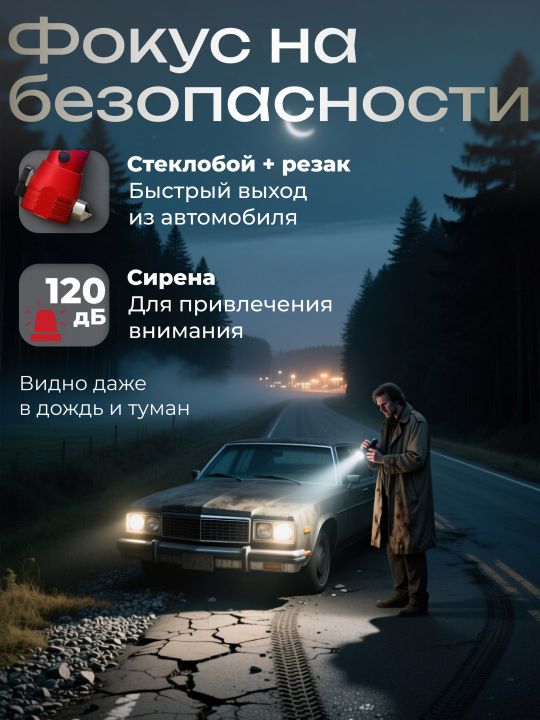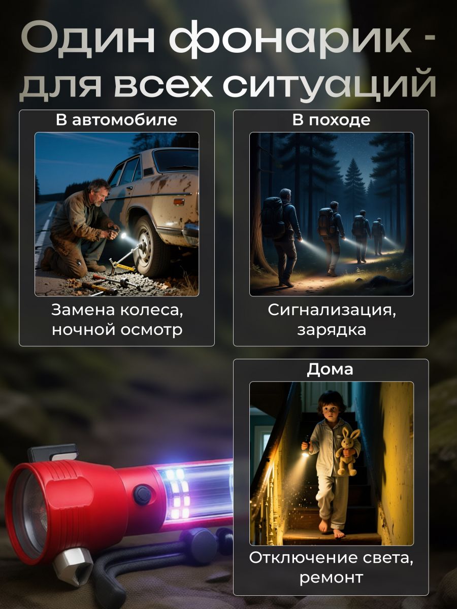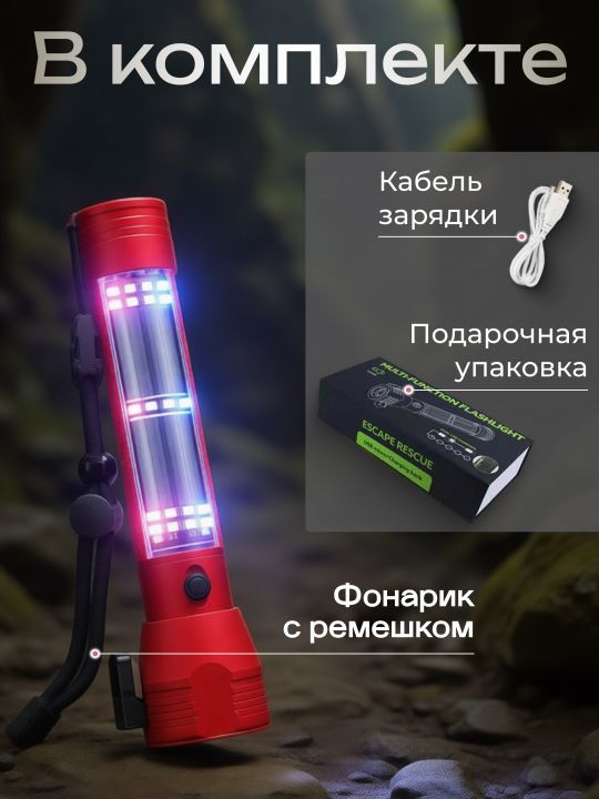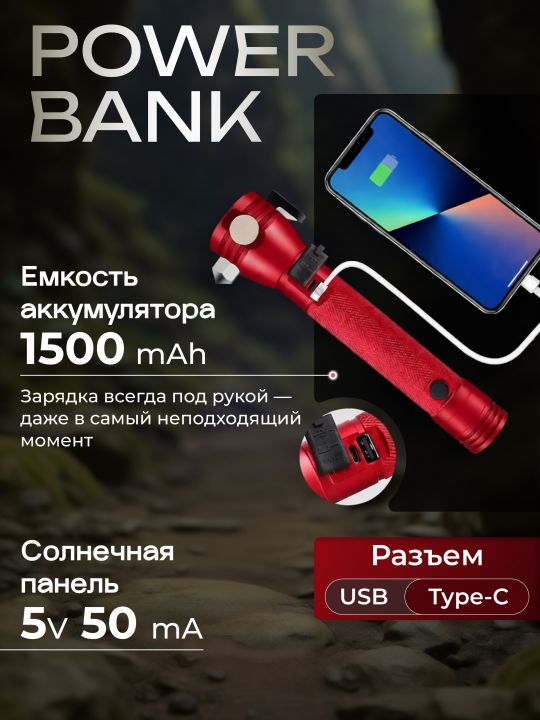 Многофункциональный фонарь 12 в 1 сочетает в себе передний и боковой свет с режимами белого, красного и синего свечения, встроенную солнечную панель и разъём Type-C для зарядки, функцию пауэрбанка через USB-выход, молоток для разбивания стекла, нож-резак для ремней и верёвок, динамик с сиреной громкостью 120 дБ для подачи сигнала SOS или отпугивания животных, мощный магнит для крепления к металлическим поверхностям, а также свисток и предохранитель от случайного включения. Мощность переднего света: T6 LED 10 Вт, дальность до 200 м. Режимы переднего света: 100%, 50%, стробоскоп. Боковой свет: 10×SMD белый, красно-синий маяк. Аккумулятор: Li-ion 18650, ёмкость 1500 mAh. Зарядка: солнечная панель 5V 50 mA, разъём Type-C. Функция: пауэрбанк через USB-выход. Сирена: громкость 120 дБ. Инструменты: молоток-забойник, нож-резак. Крепление: встроенный магнит Материал корпуса: алюминиевый сплав. Время работы: передний свет 3–6 ч, боковой свет 3–7 ч. Вес: 460 г.