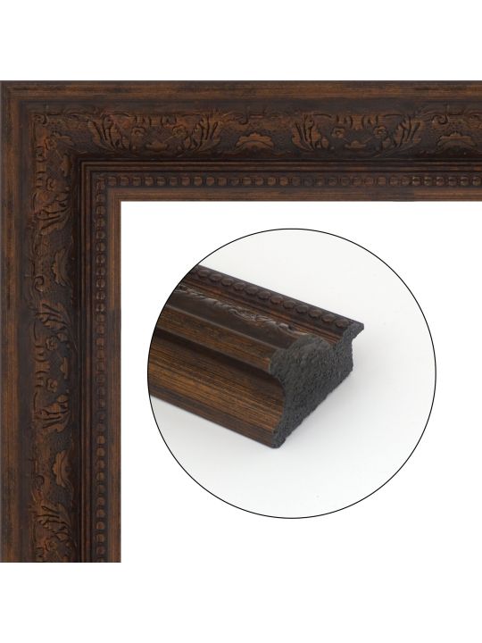 Багетная рамка изготовлена из пластика, имеются лепестки для закрепления работы. Стилизована под резное дерево. Доставляется в деревянном каркасе, который предотвращает повреждение рамки при транспортировке. Используется акриловое стекло, оно очень похоже на настоящее стекло, но не бьётся при транспортировке. На стекле имеется защитная плёнка от царапин с двух сторон, после вставки в рамку картины защитную плёнку со стекла нужно удалить. Рамка подойдёт для всех типов картин, алмазных мозаек, вышивок, а так же картин по номерам. В характеристиках товара указаны внутренние размеры рамки.