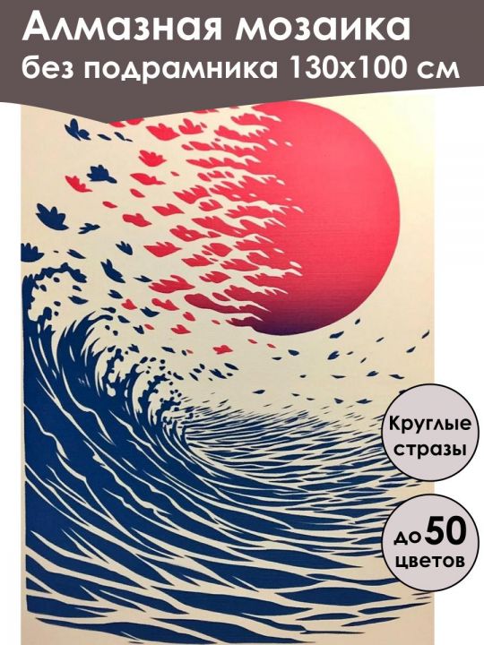 Алмазная мозаика 130×100 см собственного производства без подрамника. В картине используется до 50 оттенков для глубины цвета и плавных переходов. Надёжный клеевой слой не сохнет месяцами, стразы (26 граней) в ZIP пакетах, яркие, высокого качества и не отлетают. В наборе присутствуют дополнительно номера и инструменты, для удобства работы со стразами. Картина защищена непрозрачной бумагой. Схема напечатана водными пигментными чернилами (без свинца и запаха) в светлых пастельных тонах для комфортной работы. Плотный полухлопковый холст легко разглаживается и не мнётся. Доставляется в плотном буром тубусе. После сборки мозаика выглядит яркой и эстетичной. Узкие края предназначены для оформления в багет или обычную рамку. На изображении представлено стилизованное графическое изображение: слева снизу изображена синяя морская волна с деталями в виде тонких линий, справа вверху возвышается большой красный круг, напоминающий солнце или луну, из которого вылетают множество птиц разных размеров, создавая впечатление движения и соединения элементов природы.