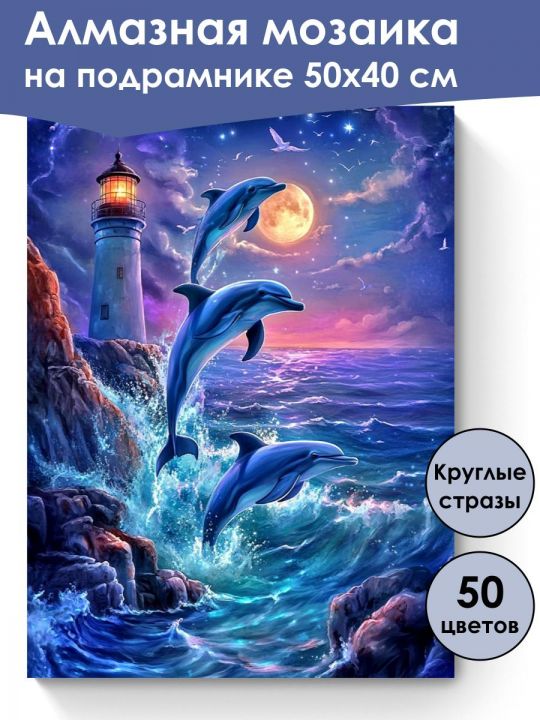 Алмазная мозаика 50×40 см собственного производства на подрамнике. В картине используется до 50 оттенков для глубины цвета и плавных переходов. Надёжный клеевой слой не сохнет месяцами, стразы (26 граней) яркие, высокого качества и не отлетают. В наборе присутствуют дополнительно ZIP пакеты, номера и инструменты, для удобства работы со стразами. Картина защищена прозрачной плёнкой. Схема напечатана водными пигментными чернилами (без свинца и запаха) в светлых пастельных тонах для комфортной работы. Плотный полухлопковый холст легко разглаживается и не мнётся. Доставляется в бурой коробке. После сборки мозаика выглядит яркой и эстетичной. Картину можно повесить на стену используя крепление которое идёт в комплекте. На изображении показана летняя ночная сцена с ярким полнолунием и звёздным небом, на фоне которого три дельфина грациозно прыгают из волн океана рядом с величественным маяком, излучающим тёплый свет; берег обрамлен скалами, добавляя природного очарования картине.
