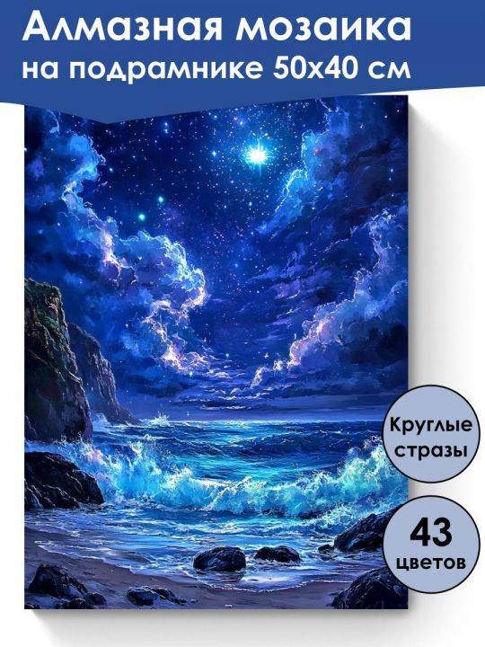 Алмазная мозаика 50×40 см собственного производства на подрамнике. В картине используется до 43 оттенков для глубины цвета и плавных переходов. Надёжный клеевой слой не сохнет месяцами, стразы (26 граней) яркие, высокого качества и не отлетают. В наборе присутствуют дополнительно ZIP пакеты, номера и инструменты, для удобства работы со стразами. Картина защищена прозрачной плёнкой. Схема напечатана водными пигментными чернилами (без свинца и запаха) в светлых пастельных тонах для комфортной работы. Плотный полухлопковый холст легко разглаживается и не мнётся. Доставляется в бурой коробке. После сборки мозаика выглядит яркой и эстетичной. Картину можно повесить на стену используя крепление которое идёт в комплекте. На изображении представлена ночная сцена на побережье: бурные волны омывают песчаный берег и тёмные камни, на фоне которых виднеются крутые скалистые утёсы; небо глубоко синего цвета, обрамлённое драматическими облаками, усыпано множеством ярких звёзд, в центре которых светит одна особенно яркая звезда, отражающаяся в воде и придающая всей сцене мистический и завораживающий вид.