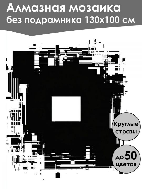 Алмазная мозаика 130×100 см собственного производства без подрамника. В картине используется до 50 оттенков для глубины цвета и плавных переходов. Надёжный клеевой слой не сохнет месяцами, стразы (26 граней) в ZIP пакетах, яркие, высокого качества и не отлетают. В наборе присутствуют дополнительно номера и инструменты, для удобства работы со стразами. Картина защищена непрозрачной бумагой. Схема напечатана водными пигментными чернилами (без свинца и запаха) в светлых пастельных тонах для комфортной работы. Плотный полухлопковый холст легко разглаживается и не мнётся. Доставляется в плотном буром тубусе. После сборки мозаика выглядит яркой и эстетичной. Узкие края предназначены для оформления в багет или обычную рамку. На изображении представлена абстрактная черно-белая композиция, где центральный квадрат окружен хаотичным распределением различных геометрических фигур и линий, создающих эффект пиксельного шума или цифровой дезинтеграции.