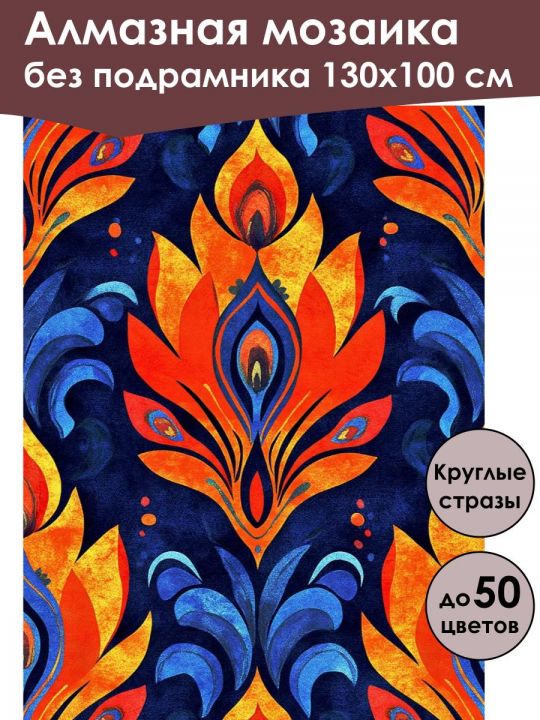 Алмазная мозаика 130×100 см собственного производства без подрамника. В картине используется до 50 оттенков для глубины цвета и плавных переходов. Надёжный клеевой слой не сохнет месяцами, стразы (26 граней) в ZIP пакетах, яркие, высокого качества и не отлетают. В наборе присутствуют дополнительно номера и инструменты, для удобства работы со стразами. Картина защищена непрозрачной бумагой. Схема напечатана водными пигментными чернилами (без свинца и запаха) в светлых пастельных тонах для комфортной работы. Плотный полухлопковый холст легко разглаживается и не мнётся. Доставляется в плотном буром тубусе. После сборки мозаика выглядит яркой и эстетичной. Узкие края предназначены для оформления в багет или обычную рамку. Изображение представляет собой яркий узор в стиле фэнтези с доминирующими оранжевыми и синими акцентами на тёмно-синем фоне, формирующими форму, напоминающую стилизованный цветок или пламя, окружённое симметричными волнообразными элементами и маленькими точками для дополнительного динамичного эффекта.