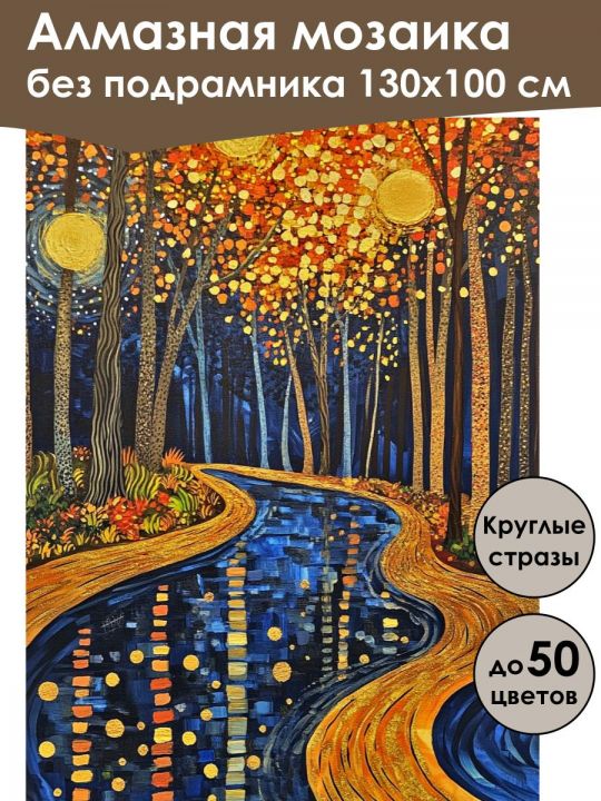 Алмазная мозаика 130×100 см собственного производства без подрамника. В картине используется до 50 оттенков для глубины цвета и плавных переходов. Надёжный клеевой слой не сохнет месяцами, стразы (26 граней) в ZIP пакетах, яркие, высокого качества и не отлетают. В наборе присутствуют дополнительно номера и инструменты, для удобства работы со стразами. Картина защищена непрозрачной бумагой. Схема напечатана водными пигментными чернилами (без свинца и запаха) в светлых пастельных тонах для комфортной работы. Плотный полухлопковый холст легко разглаживается и не мнётся. Доставляется в плотном буром тубусе. После сборки мозаика выглядит яркой и эстетичной. Узкие края предназначены для оформления в багет или обычную рамку. На картине изображён волшебный лесной пейзаж с извилистой дорогой, проходящей через густой осенний лес. Деревья осыпаны яркими оранжевыми и жёлтыми листьями, излучающими свет, напоминая ночное небо с сияющими звёздами. Извилистый путь, усеянный жёлтым, идёт вдоль реки, вода в которой отражает окружающую природу в мягких оттенках синего, усиливая атмосферу уюта и фантазии.