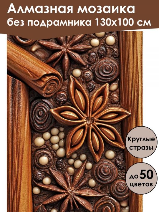 Алмазная мозаика 130×100 см собственного производства без подрамника. В картине используется до 50 оттенков для глубины цвета и плавных переходов. Надёжный клеевой слой не сохнет месяцами, стразы (26 граней) в ZIP пакетах, яркие, высокого качества и не отлетают. В наборе присутствуют дополнительно номера и инструменты, для удобства работы со стразами. Картина защищена непрозрачной бумагой. Схема напечатана водными пигментными чернилами (без свинца и запаха) в светлых пастельных тонах для комфортной работы. Плотный полухлопковый холст легко разглаживается и не мнётся. Доставляется в плотном буром тубусе. После сборки мозаика выглядит яркой и эстетичной. Узкие края предназначены для оформления в багет или обычную рамку. На изображении композиция из бадьяна, палочек корицы и декоративных шариков на текстурированном фоне, создающих теплую атмосферу с акцентом на естественные оттенки коричневого.