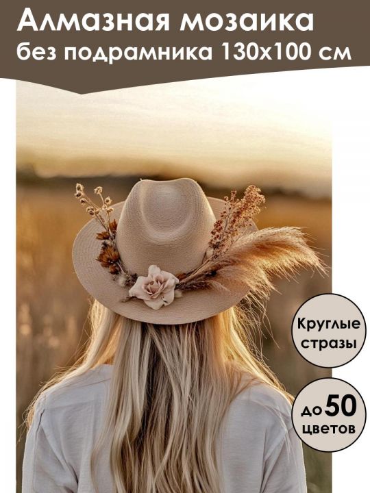Алмазная мозаика 130×100 см собственного производства без подрамника. В картине используется до 50 оттенков для глубины цвета и плавных переходов. Надёжный клеевой слой не сохнет месяцами, стразы (26 граней) в ZIP пакетах, яркие, высокого качества и не отлетают. В наборе присутствуют дополнительно номера и инструменты, для удобства работы со стразами. Картина защищена непрозрачной бумагой. Схема напечатана водными пигментными чернилами (без свинца и запаха) в светлых пастельных тонах для комфортной работы. Плотный полухлопковый холст легко разглаживается и не мнётся. Доставляется в плотном буром тубусе. После сборки мозаика выглядит яркой и эстетичной. Узкие края предназначены для оформления в багет или обычную рамку. На изображении человек с длинными светлыми волосами стоит спиной в поле, освещенном мягким светом заходящего солнца. На нём светлая шляпа, украшенная сухоцветами и крупным цветком, создающая атмосферу уюта и природы в золотой час.
