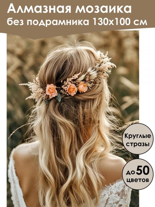 Алмазная мозаика 130×100 см собственного производства без подрамника. В картине используется до 50 оттенков для глубины цвета и плавных переходов. Надёжный клеевой слой не сохнет месяцами, стразы (26 граней) в ZIP пакетах, яркие, высокого качества и не отлетают. В наборе присутствуют дополнительно номера и инструменты, для удобства работы со стразами. Картина защищена непрозрачной бумагой. Схема напечатана водными пигментными чернилами (без свинца и запаха) в светлых пастельных тонах для комфортной работы. Плотный полухлопковый холст легко разглаживается и не мнётся. Доставляется в плотном буром тубусе. После сборки мозаика выглядит яркой и эстетичной. Узкие края предназначены для оформления в багет или обычную рамку. На изображении девушка с длинными светлыми волосами, декорированными цветочным венком из оранжевых роз и сухих колосьев. Она стоит спиной, одетая в белое кружевное платье, на фоне поля с колосящейся пшеницей, создавая атмосферу естественной нежности и романтичности.